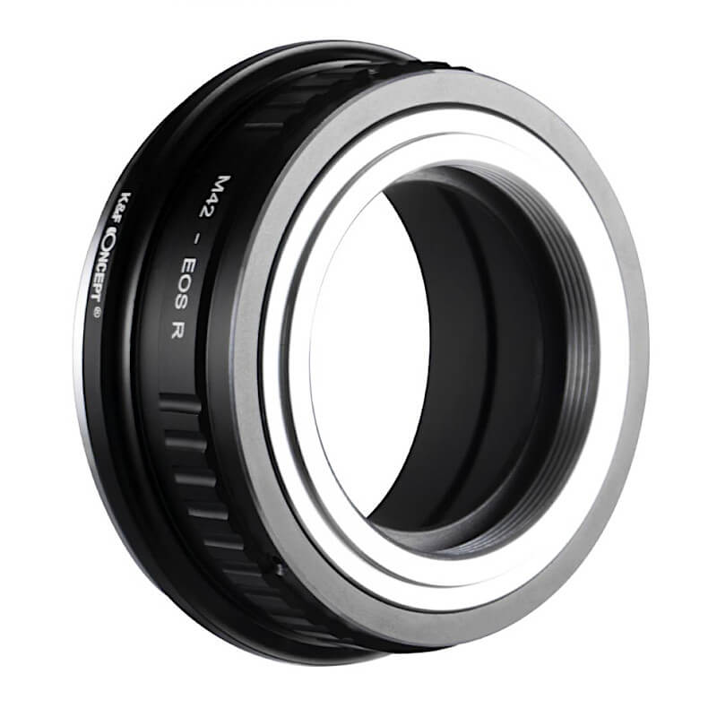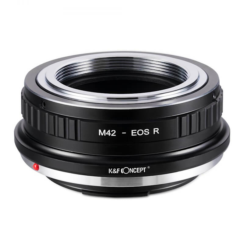 Aluminiowy, lekki i odporny na uszkodzenia mechaniczne adapter bagnetowy marki K&F Concept umożliwiający podpięcie analogowych obiektywów z mocowaniem M42 z pełnoklatkowymi aparatami bezlusterkowymi Canon z bagnetem typu RF (EOS R) - R5, R6, R czy RP.