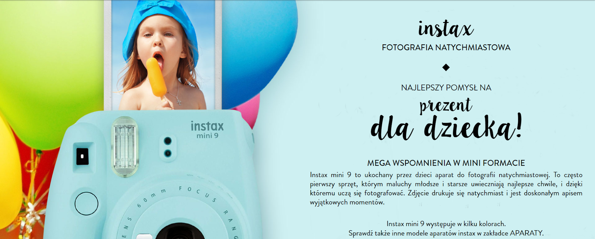 Instax Mini 9 Clear fioletowy to aparat idealny na imprezy, festiwale, przyjęcia i wypady za miasto, pozwalającym uchwycić najlepszy moment i wydrukować odbitki retro jednym ruchem aparatu. Instax mini 9 jest dostępny w pięciu modnych kolorach: „flamingowy różowy”, „limonkowy”, „kobaltowy”, „przydymiona biel” i „zimny błękit” i zaprojektowany z myślą o gustach wrażliwych na design młodych ludzi, zaczynających przygodę z fotografią.