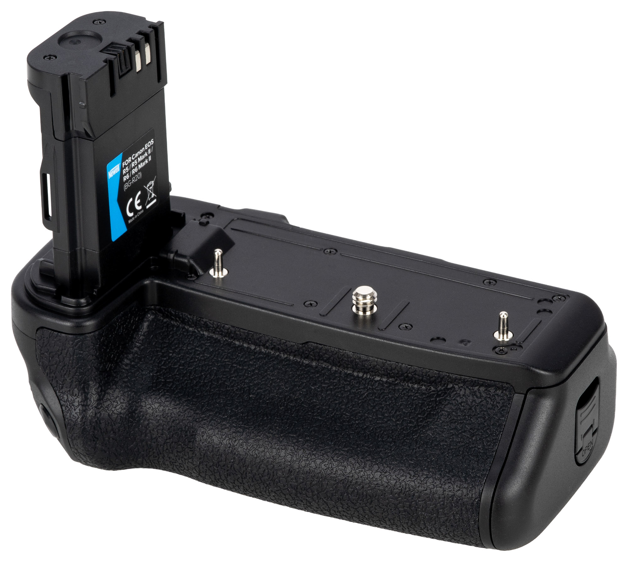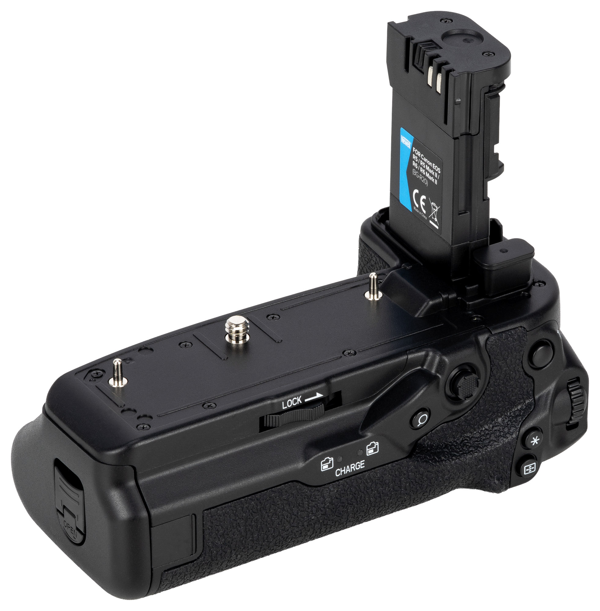Battery Pack Newell BG-R20 to uchwyt zasilający zaprojektowany z myślą o aparatach Canon EOS R5, R5 Mark II, R6 i R6 Mark II. Mieści dwa akumulatory (LP-E6NH, LP-E6N, LP-E6 lub ich zamienniki), znacząco wydłużając czas pracy bez przerw. Inteligentny system zarządzania energią wykorzystuje najpierw ogniwo o wyższym poziomie naładowania, a gdy jest on taki sam – pracuje równocześnie na obu. Wbudowany port USB-C umożliwia ładowanie akumulatorów bez ich wyjmowania. Ergonomiczna konstrukcja z dodatkowymi przyciskami sterującymi ułatwia fotografowanie w pionie. Grip zapewnia lepszy chwyt i wyważenie zestawu z cięższymi obiektywami. Specjalny uchwyt na klapkę komory akumulatora chroni przed jej zgubieniem. Produkt objęty 40-miesięcznym programem ochrony Newell.
