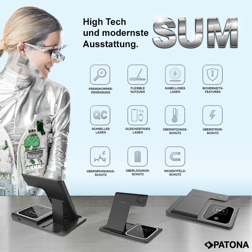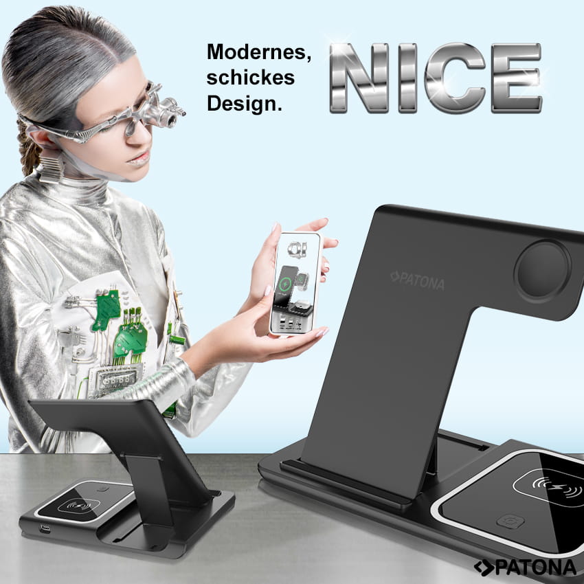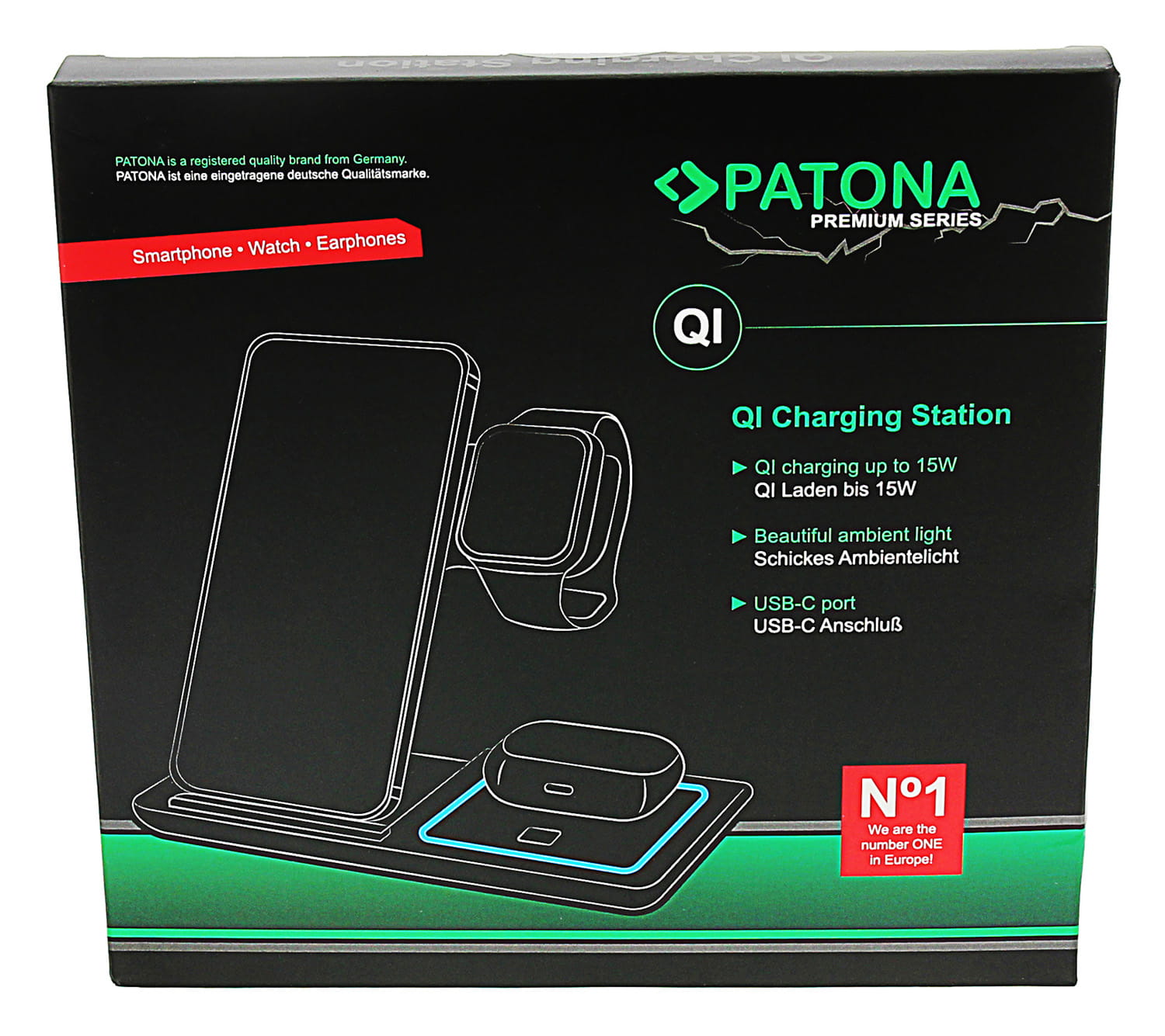 Nowością w rodzinie produktów PATONA przedstawiamy naszą nową bezprzewodową ładowarkę QI 3w1 do smartfonów, iPhone'ów, zegarków, TW (True Wireless Stereo), zestawów słuchawkowych Bluetooth oraz AirPods. Ładowarka ta daje możliwość ładowania 3 urządzeń jednocześnie. Jest dostępny w kolorze czarnym i ma nowy design, a dzięki inteligentnemu projektowi idealnie pasuje do codziennego życia. Idealny dla profesjonalistów i częstych użytkowników do stałego i elastycznego użytkowania z wysoką wydajnością i długą żywotnością. Jest również składany, dzięki czemu można go transportować i przechowywać w sposób oszczędzający miejsce. Smartfon można ładować pionowo lub poziomo. Zasilanie zapewnia dołączony kabel USB-C.