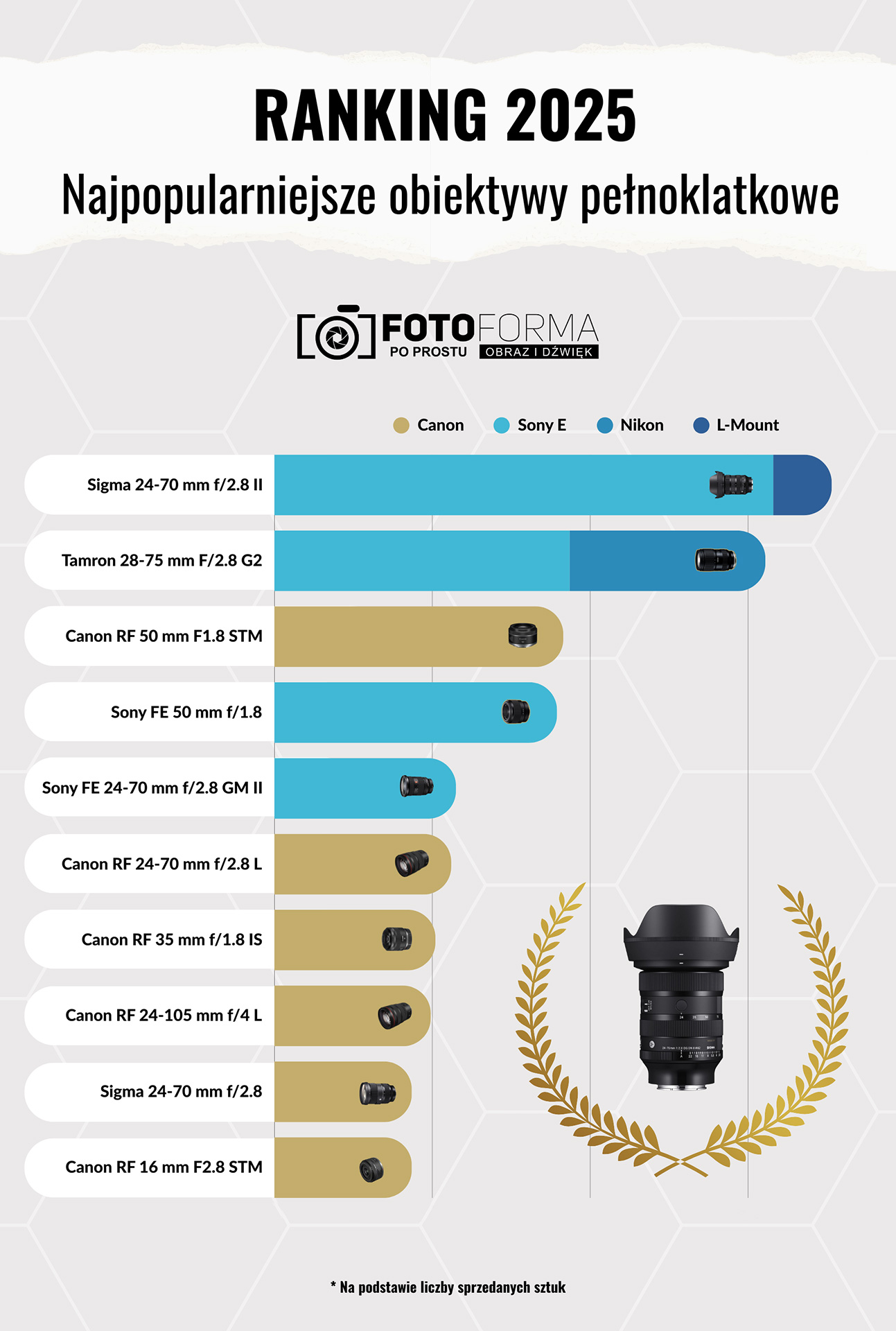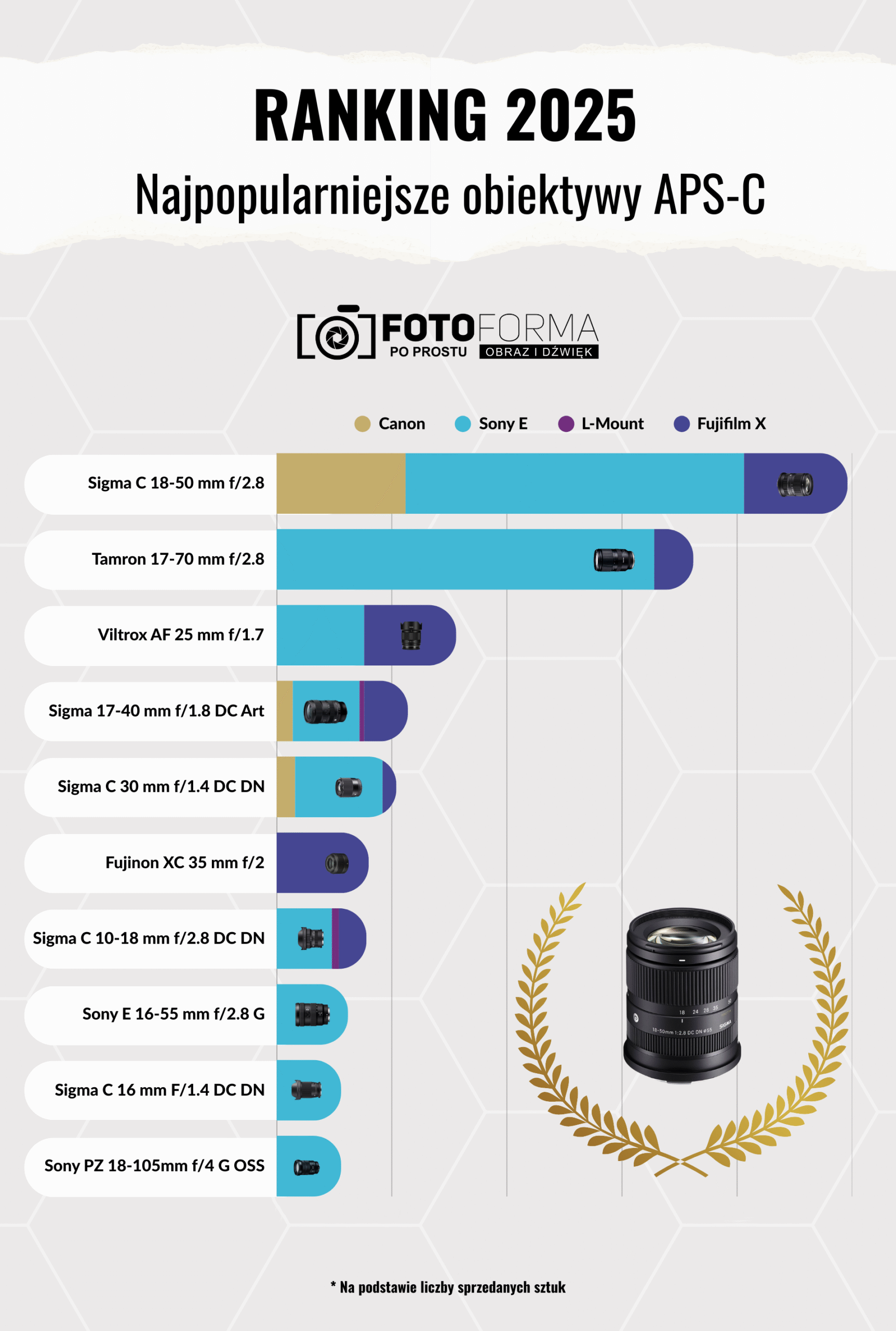 W 2025 roku widać spore zmiany w upodobaniach twórców w Polsce. Dominują już nie tylko klasyki, czyli jasne, małe i niedrogie stałki, ale uniwersalne, jasne i dobre jakościowo zoomy. Oczywiście Polacy najbardziej cenią obiektywy o dobrym stosunku jakości optycznej do ceny, jak Sigma czy Tamron, ale widać też spore zainteresowanie obiektywami natywnymi, które może nie są w TOP 3, ale dominują w liczbie różnych modeli w czołówce. Wyniki sprzedaży w dużej mierze kształtują twórcy zarabiający na fotografii i filmowaniu, stąd taki pragmatyczny, uniwersalny wybór. Moim zdaniem największym wygranym 2025 roku wśród marek produkujących obiektywy jest Sigma, której produkty wygrały w każdej kategorii. Wejście w bagnet Canon RF-S było świetnym posunięciem, a strzałem w dziesiątkę rewelacyjny model Sigma 17-40 mm f/1.8 Art. Przypuszczam, że w 2026 roku, ten zoom może wejść do TOP 3 wśród obiektywów APS-C.