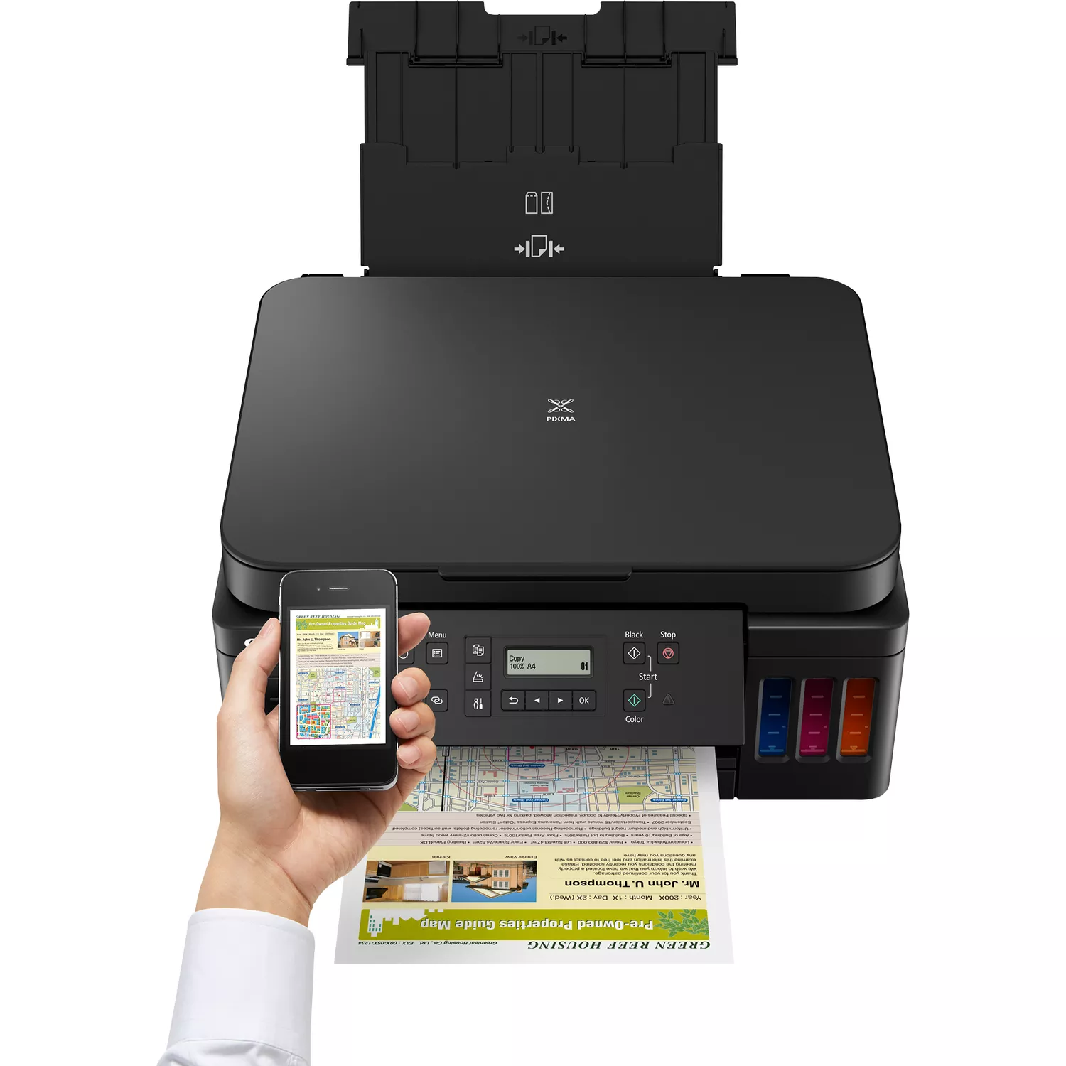 Drukarka Canon PIXMA G6040 „3 w 1” z uzupełnianymi zbiornikami z atramentem to inteligentne połączenie wielu funkcji i niskich kosztów eksploatacji, które umożliwia ekonomiczne drukowanie dużych nakładów