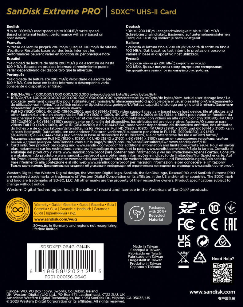 Specyfikacja techniczna - Karta SanDisk Extreme PRO SDXC 64GB - 280/100 MB/s V60 UHS-II