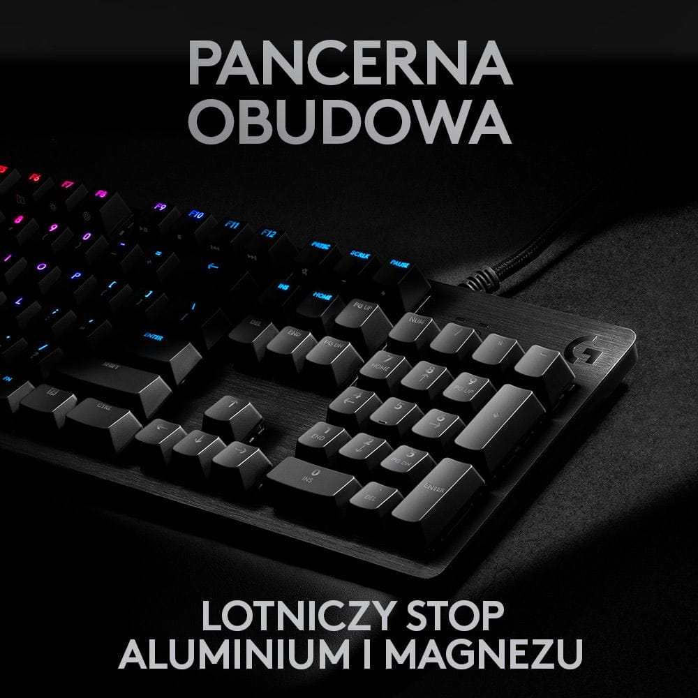 Wytrzymałość i piękno. Klawiatura G513 została wykonana z niesamowicie silnego i wytrzymałego stopu aluminium i magnezu 5052, co pozwoliło uzyskać minimalistyczną konstrukcję w połączeniu z pięknym wyglądem. Sztywny stop 5052 wykorzystano także do wytrzymałej, nieślizgającej się obudowy, w której umieszczono pełny zestaw funkcji zapewniających niezrównane wrażenia podczas rozgrywki.