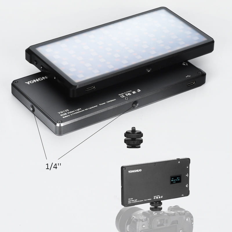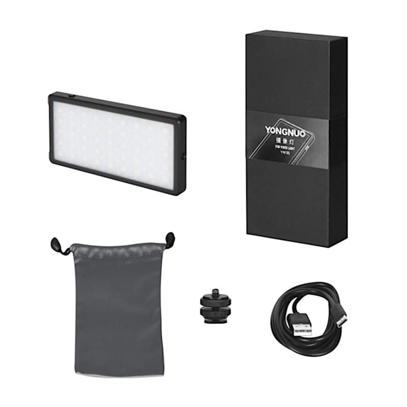 Poręczna lampa LED Yongnuo YN135 z regulacją mocy i temperatury barwowej od 3200 do 5600 K oraz możliwością pracy w przestrzeni barw RGB. Kompaktowych rozmiarów panel jest wyposażony łącznie w 135 diod, z czego 45 odpowiada za emisję światła ciepłego, 45 za światło zimne, a kolejne 45 za światło kolorowe. Lampa cechuje się też wysokim wskaźnikiem CRI 95+ w trybie światła białego CCT, co gwarantuje wierną reprodukcję nasyconych i naturalnych kolorów.