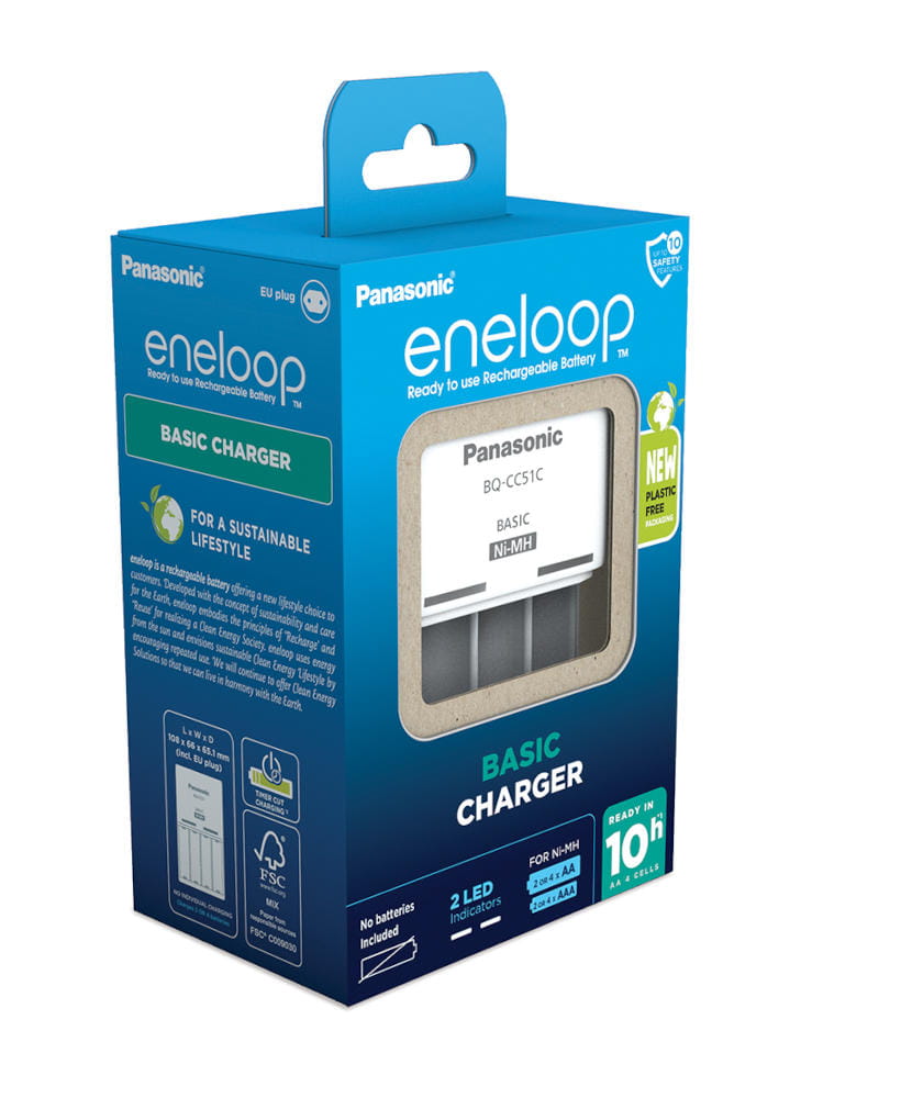 BQ-CC51 to standardowa ładowarka eneloop, idealna dla okazjonalnych użytkowników. Ładowarka pozwala na szybkie ładowanie do 4 akumulatorów AA lub AAA (jednocześnie można ładować 2 lub 4 akumulatory). Urządzenie posiada 2 diody LED, sygnalizujące proces ładowania. Przydatną funkcją jest sterowanie czasowe, dzięki któremu ładowarka sama zakończy proces ładowania po ok. 13 godzinach od momentu podłączenia jej do źródła zasilania.