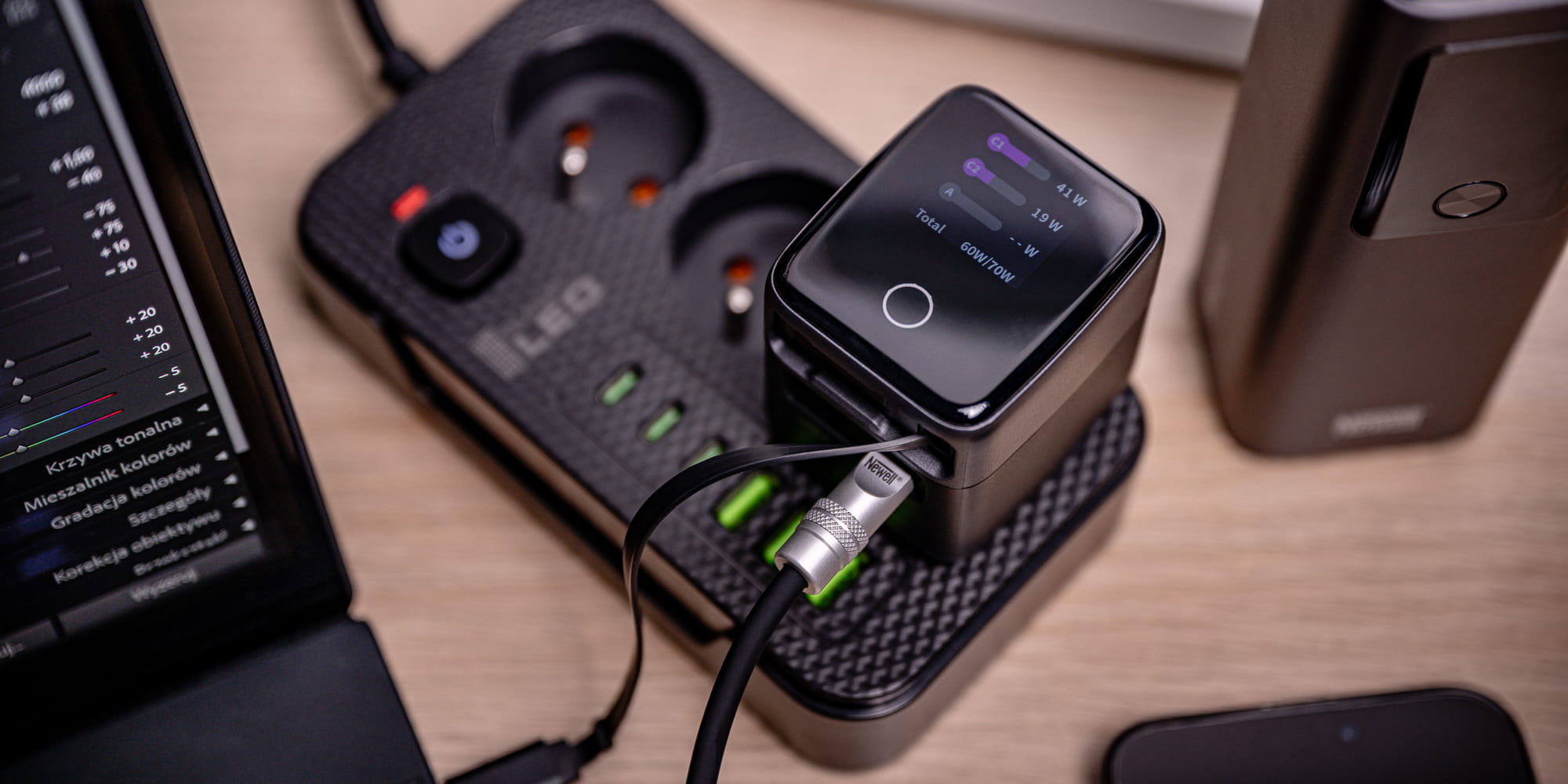 Newell GaN 70 W TFT to nowoczesna ładowarka sieciowa, która pozwala jednocześnie zasilać nawet trzy urządzenia, z maksymalną mocą 70 watów. Oferuje 3 wyjścia: USB-C, USB-A oraz zintegrowany kabel USB-C. Zapewnia szybkie ładowanie wspierane przez technologie Power Delivery, Quick Charge i PPS. Duży, podświetlany ekran TFT pokazuje między innymi: aktualną moc, temperaturę i czas użytkowania. Technologia GaN (azotek galu) gwarantuje wysoką wydajność i niską temperaturę pracy. Kompaktowe wymiary, pełen zestaw zabezpieczeń i 40-miesięczny okres wsparcia producenta sprawiają, że to idealny towarzysz codziennych zadań i podróży, który zostanie z Tobą na długie lata.