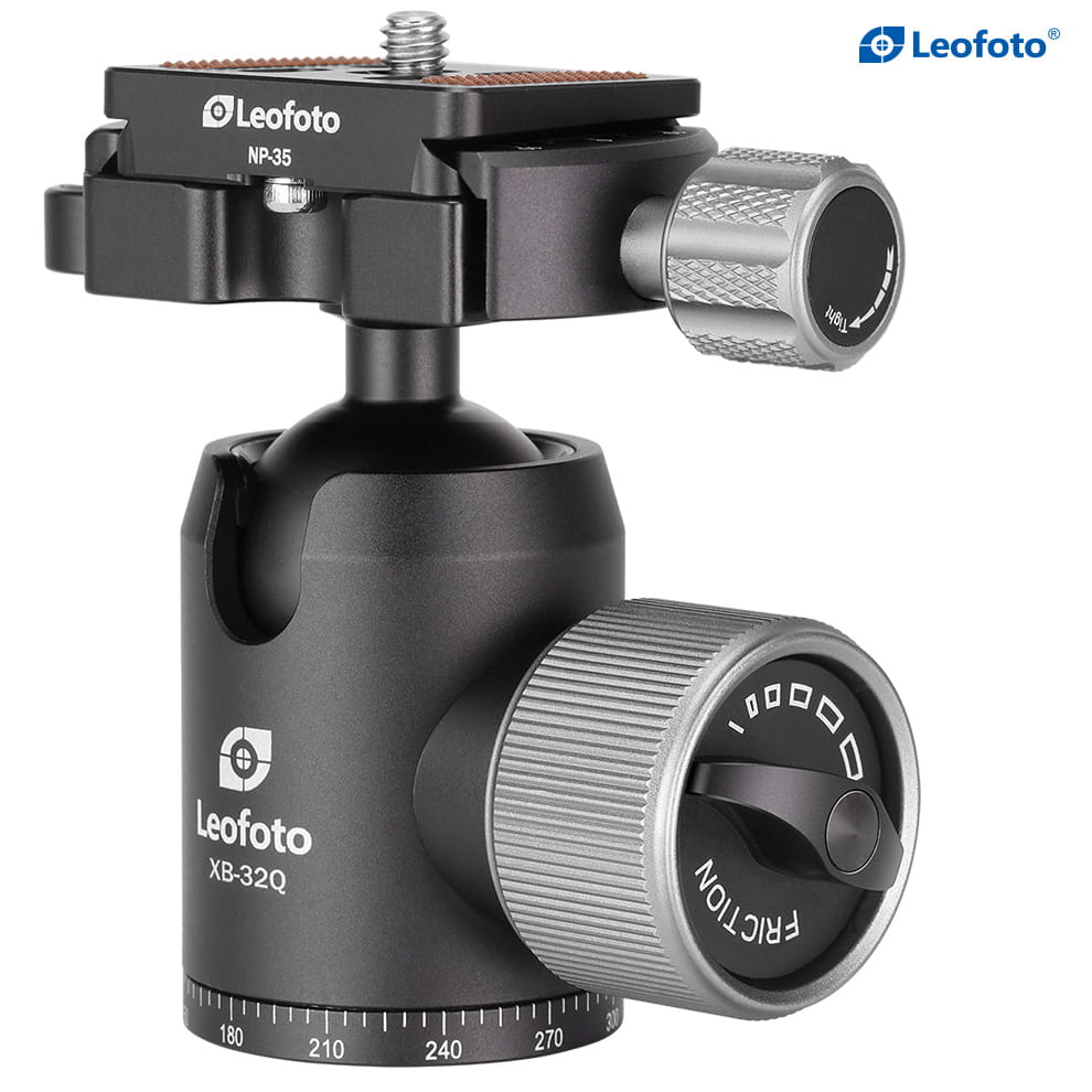 Leofoto XB-32Q to głowica kulowa klasy premium z płynną kulą o średnicy 32 mm, obracaną podstawą i niezależnymi pokrętłami do blokady ruchu oraz regulacji oporu.