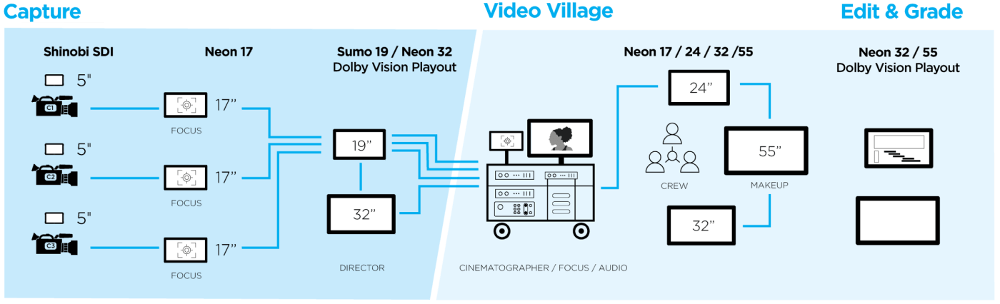 Neon ma rozmiary 17 ”, 24”, 31 ”i 55” i uzupełnia inne produkty Atomos, takie jak Shinobi SDI, Ninja V, Shogun 7 i Sumo 19, zapewniając elastyczny ekosystem monitorów referencyjnych. Neon pozwala na elastyczność korzystania z Atomos w niskobudżetowych produkcjach z 10-bitowymi nieskompresowanymi kamerami HDMI, aż do 12-bitowego SDI 12-bitowego, 4Kp60 RAW z najlepszych kamer kinowych na świecie.