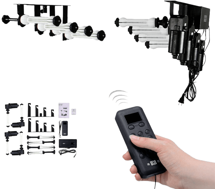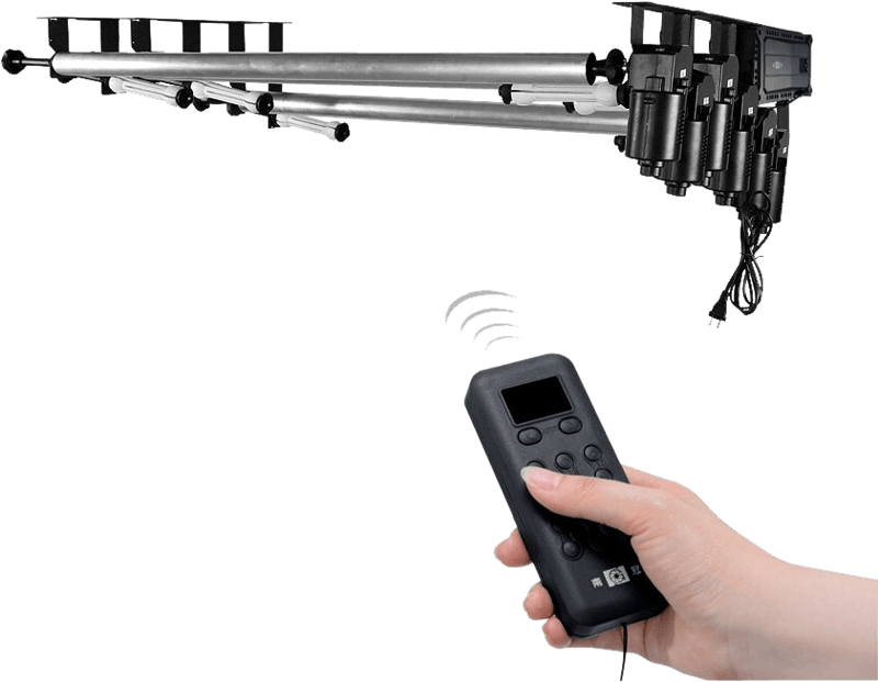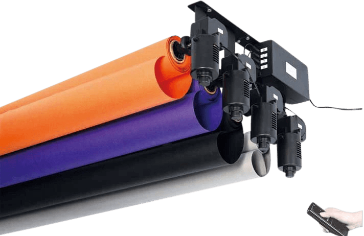 Ten zmotoryzowany elektryczny zestaw napędu tła może napędzać 3 rolki papieru / muślinu / tkaniny. Można je mocować na statywach, ścianie lub suficie.