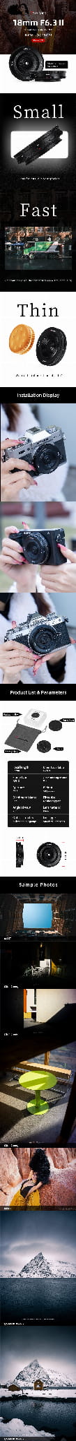 Elegancki i uniwersalny obiektyw 18mm f/6.3 Mark II do FUJIFILM X od 7artisans to niewielki, szerokokątny obiektyw typu pancake prime, który doskonale nadaje się do fotografii ulicznej i dokumentalnej, a także do wykonywania zwykłych zdjęć. Równie mały, co prosty, obiektyw ten wyróżnia się stałą przysłoną f/6.3 oraz trwałą metalową konstrukcją.