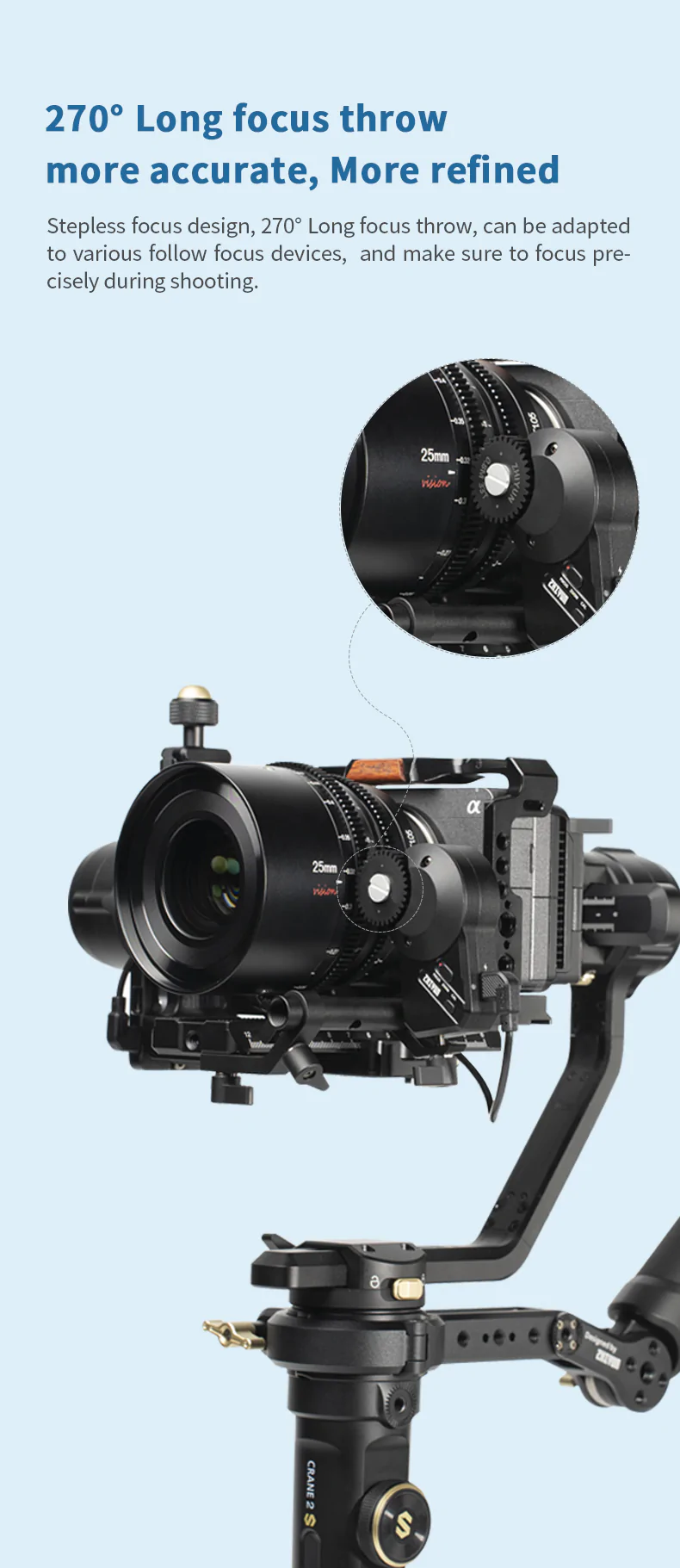 Rzut ostrości 270° pozwala na niezwykle precyzyjne ustawienie ostrości, a obiektyw wyposażony jest w standardowe, kinowe przekładnie 0,8 MOD dla ostrości i przysłony. Średnica przedniej części obiektywu 90 mm pozwala na użycie wielu standardowych matte boxów, a gwint filtrów 82 mm pozwala na zamontowanie opcjonalnych filtrów bezpośrednio na przedniej części obiektywu.