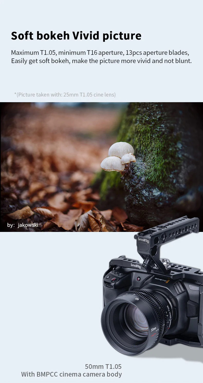 Ostry, mały, wytrzymały i niewiarygodnie szybki obiektyw Obiektyw 7Artisans Vision 35mm T1.05 został zbudowany z myślą o branży kinowej i współpracuje ze standardowymi akcesoriami do obiektywów kinowych, dzięki czemu z łatwością dopasuje się do Twojego toku pracy. Maksymalny otwór przysłony T1.05 pozwala na filmowanie delikatnego, miękkiego bokeh z miękkimi, naturalnie wyglądającymi nieostrymi refleksami, podczas gdy minimalny otwór przysłony T16 pomaga zredukować artefakty, które mogą pojawić się, gdy otwór przysłony jest zbyt mały.