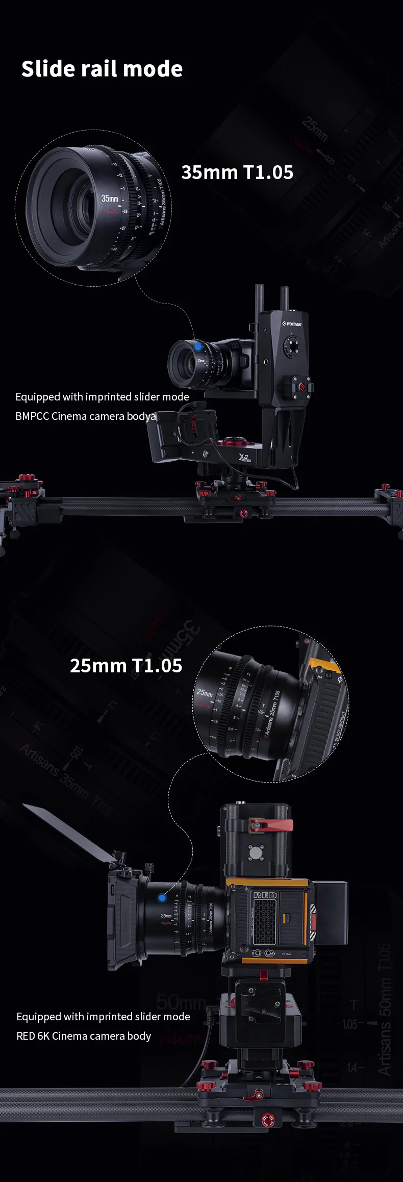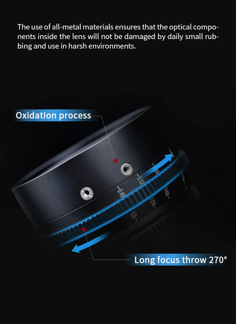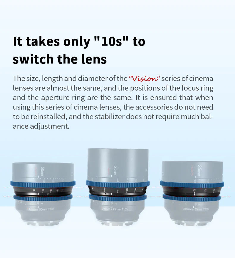 • Obiektywy z serii 7Artisans Vision Cine mają wspólne pozycje pierścieni zębatych ostrości i przysłony, co przyspiesza wymianę obiektywów, ponieważ nie trzeba zmieniać położenia akcesoriów, takich jak moduły follow focus czy silniki przysłony.