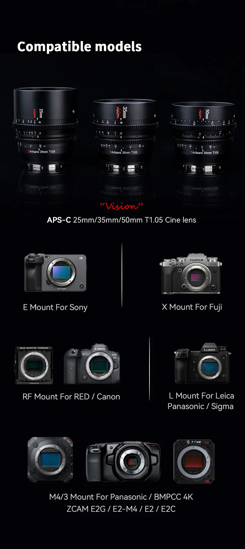 • Seria obiektywów Vision jest bardzo uniwersalna i dostępna z mocowaniami Canon RF, Sony E, Fujifilm X, Leica L oraz MFT.