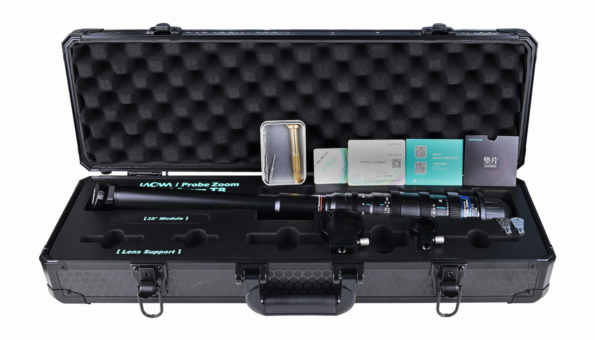Laowa Probe Zoom 15-24 mm T8 dostarczany jest w solidnej walizce zamykanej na klucz, która zapewnia maksymalne bezpieczeństwo podczas transportu i przechowywania. Jej wnętrze wypełniono pianką z precyzyjnie wyciętymi przegródkami, które idealnie dopasowują się do kształtu obiektywu i chronią go przed wstrząsami oraz uszkodzeniami mechanicznymi. W walizce znajdziesz również obejmy z gwintem do montażu obiektywu na szynie stabilizacyjnej, co ułatwia integrację z rigami filmowymi i systemami wsparcia. Dołączono również zestaw kluczy do walizki, precyzyjne śrubokręty oraz podkładki pod bagnet („shims"), które pozwalają na dokładną regulację ustawień ostrości – „back focus" i „front focus".