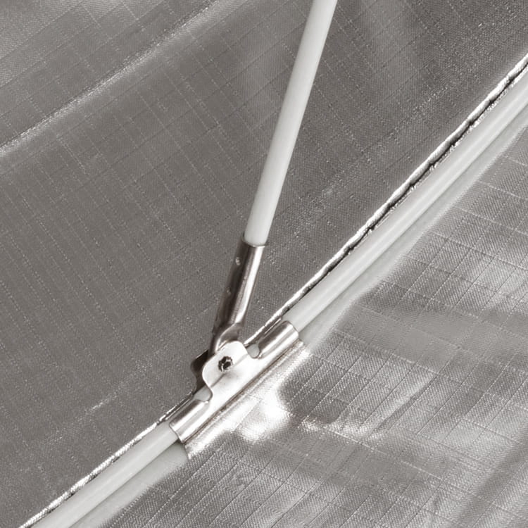 Poszycie parasola jest wykonane z nylonowego, odpornego na przetarcia materiału. Jest on dobrze spasowany i nie marszczy się. Wewnętrzna powierzchnia srebrna pozwala na uzyskanie ostrego światła, powodując tym samym wyostrzenie konturów oświetlanego obiektu.