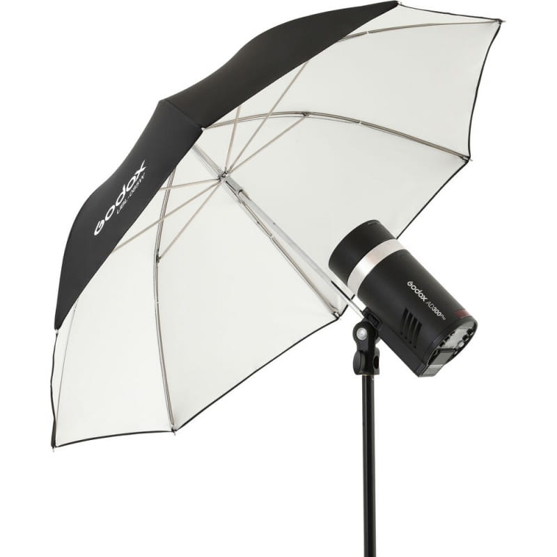 Odbijająca parasolka o średnicy 85 cm, dedykowana do AD300Pro ma białe wnętrze i czarną tkaninę na zewnątrz. Zapewnia szerokie pokrycie sceny światłem, niski kontrast i łagodne cienie.