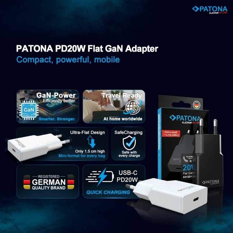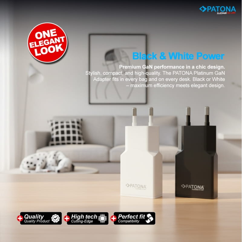 PATONA Platinum GaN PD20W w kolorze czarnym to płaska, kompaktowa ładowarka z ekskluzywnej serii Platinum, stworzona z myślą o maksymalnej wydajności, długiej żywotności i wygodzie w podróży. Dzięki nowoczesnej technologii GaN (azotek galu) oferuje szybkie ładowanie USB-C PD 3.0 / QC 3.0 przy minimalnym nagrzewaniu, a płaska konstrukcja świetnie sprawdza się w ciasnych gniazdkach, listwach i na wyjazdach.