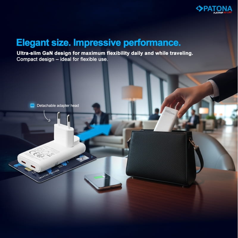 PATONA Platinum GaN PD65W w kolorze czarnym to płaska, kompaktowa ładowarka z ekskluzywnej serii Platinum, stworzona z myślą o maksymalnej wydajności, długiej żywotności i wygodzie w podróży. Dzięki nowoczesnej technologii GaN (azotek galu) oferuje szybkie ładowanie z dwóch gniazdek USB-C PD 3.0 / QC 3.0 przy minimalnym nagrzewaniu, a płaska konstrukcja świetnie sprawdza się w ciasnych gniazdkach, listwach i na wyjazdach.