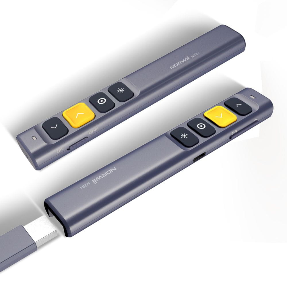 Wewnątrz ultralekkiego pilota Norwii N28s ukryto akumulator litowo-polimerowy o pojemności 300 mAh. Z łatwością naładujesz go, korzystając z popularnego portu USB-C. Gdy urządzenie będzie już na granicy wyczerpania, specjalna dioda LED zacznie mrugać na czerwono. To dodatkowe udogodnienie pozwoli uniknąć sytuacji, w których na kilka minut przed prezentacją okazuje się, że pilot nie jest gotowy do pracy.