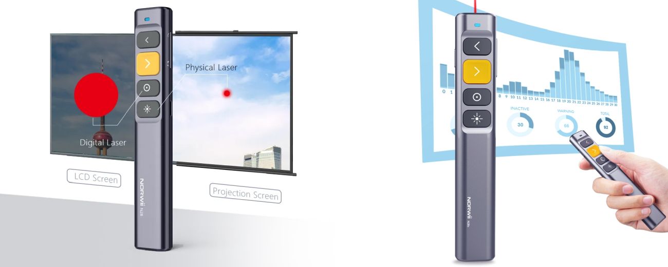 Gdy chcesz pokazać coś na ekranie LCD lub LED, wskaźnik laserowy może nie być wystarczająco dobrze widoczny. Z pomocą przychodzą cyfrowe wskaźniki, które zamieniają kursor w charakterystyczną czerwoną kropkę. Pilot do prezentacji multimedialnych Norwii N28s jest kompatybilny z tego typu wirtualnymi rozwiązaniami, jakie oferują programy do pokazów slajdów. Prezentacja treści będzie dzięki temu tak samo efektowna, niezależnie od tego, czy korzystasz z rzutnika, czy dużego ekranu.