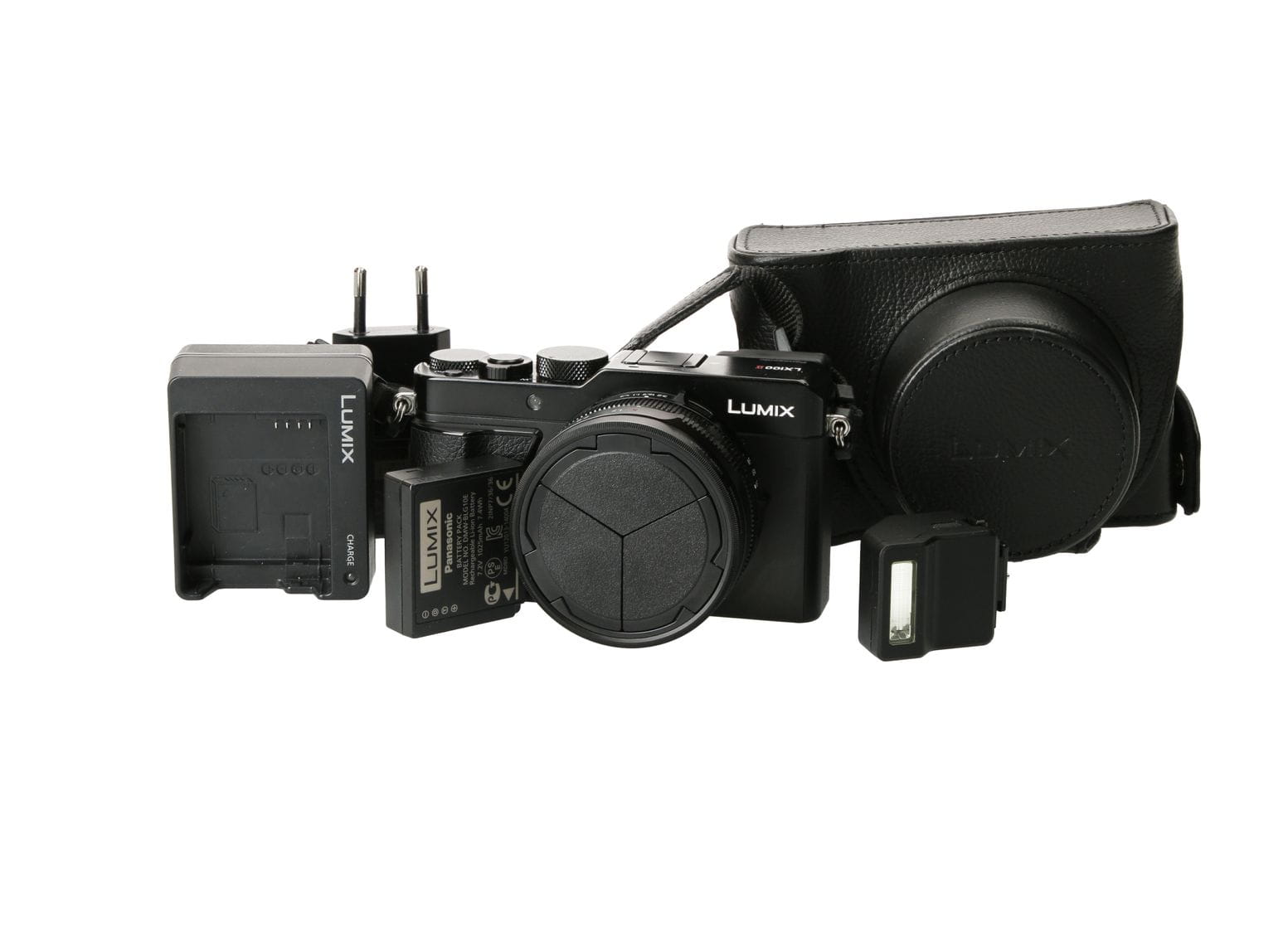 W zestawie aparat, bateria, ładowarka, skórzane etui, dekielek automatyczny DMW-LFAC1.