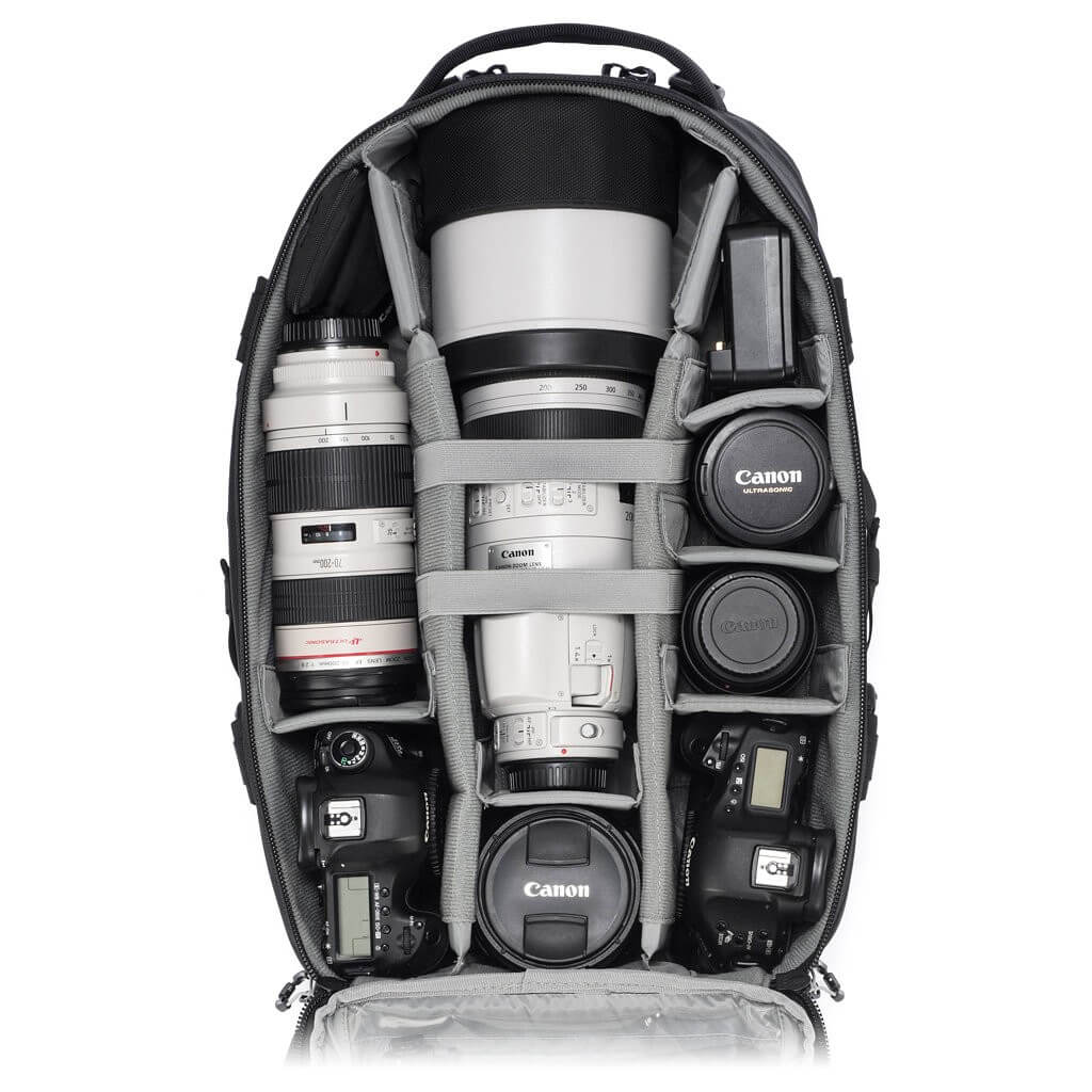 • Obszerna główna komora do transportu profesjonalnych lustrzanek wraz z obiektywami i lampami błyskowymi.