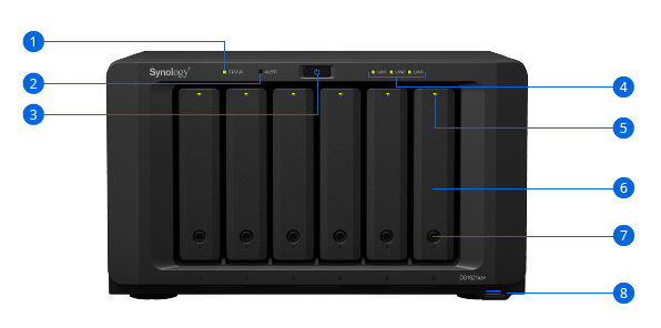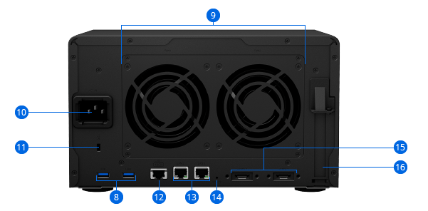 - Pojemność pamięci masowej może zostać zwiększona do maks. 16 dysków przy użyciu dwóch jednostek rozszerzających Synology DX5172.