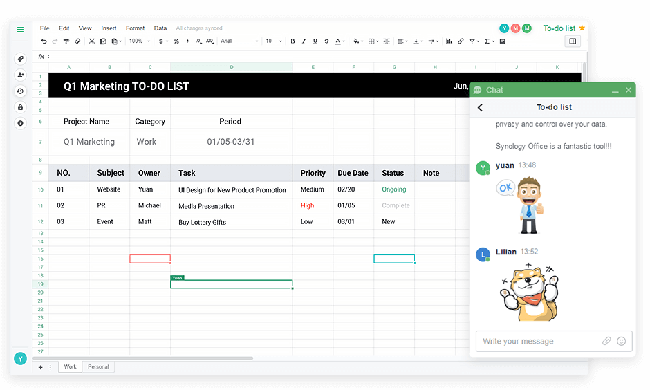 - Pakiet Synology Office obejmuje aplikacje Documents, Spreadsheets i Slides. Środowisko edycji online umożliwia wielu użytkownikom równoczesną edycję, komentowanie i udostępnianie danych firmy — bez dodatkowych opłat licencyjnych.