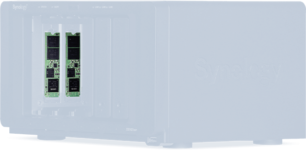 - Dwa gniazda M.2 2280 NVMe SSD umożliwiają pełne wykorzystanie funkcji pamięci podręcznej SSD firmy Synology. Dodanie pamięci podręcznej SSD zapewnia nawet 20-krotnie szybszy czas odpowiedzi we/wy bez korzystania z przednich kieszeni dysków.