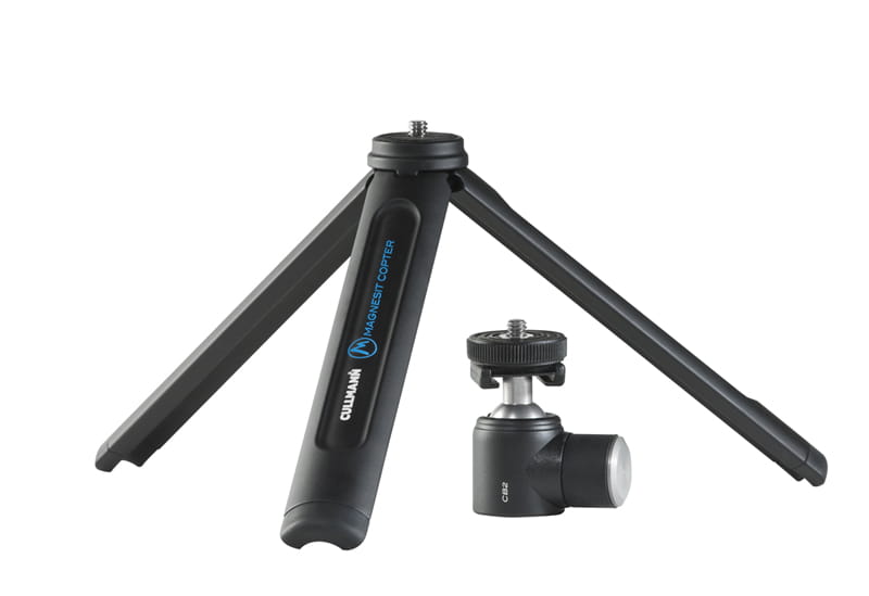 MAGNESIT COPTER to mini statyw przeznaczony do lustrzanek z funkcją filmowania jak i do większych kamer cyfrowych. Jego mała konstrukcja jest idealna do przewożenia w małych torbach lub nawet przypięcia do torby. Statyw można rozłożyć do wysokości 10 cm. Maksymalne obciążenie to 4kg. Po złożeniu ma 16cm.