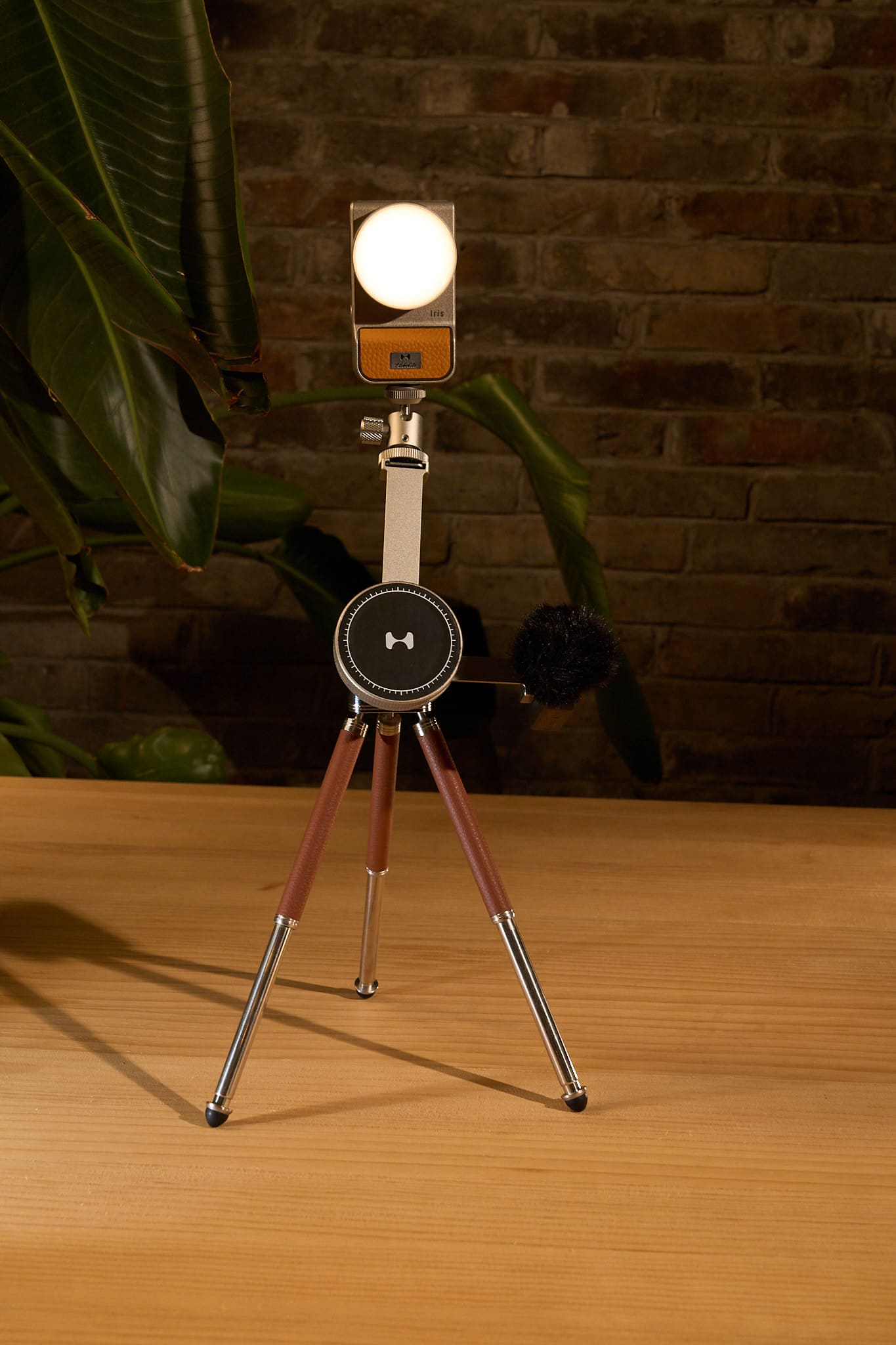 Statyw stołowy Harlowe posiada okrągłe mocowanie magnetyczne w pełni kompatybilne ze standardem MagSafe, zapewniając bezpieczne i płynne połączenie z urządzeniami wyposażonymi w MagSafe oraz możliwość zamontowania lamp Harlowe w celu ulepszenia zdjęć lub filmów.