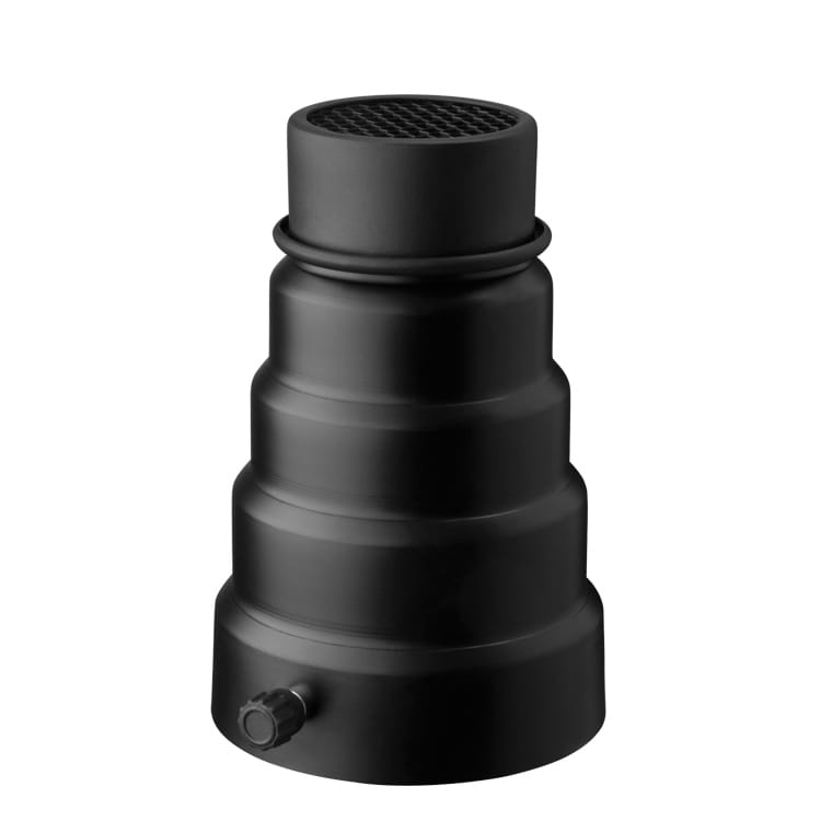Strumienica (snoot) z mocowaniem Delicacy II, wyposażona w grid. Zamontowana na lampie studyjnej pozwala na uzyskanie punktowego światła - np. w celu doświetlenia małego fragmentu kadru lub rozświetlania włosów modelki w przypadku zdjęć portretowych.