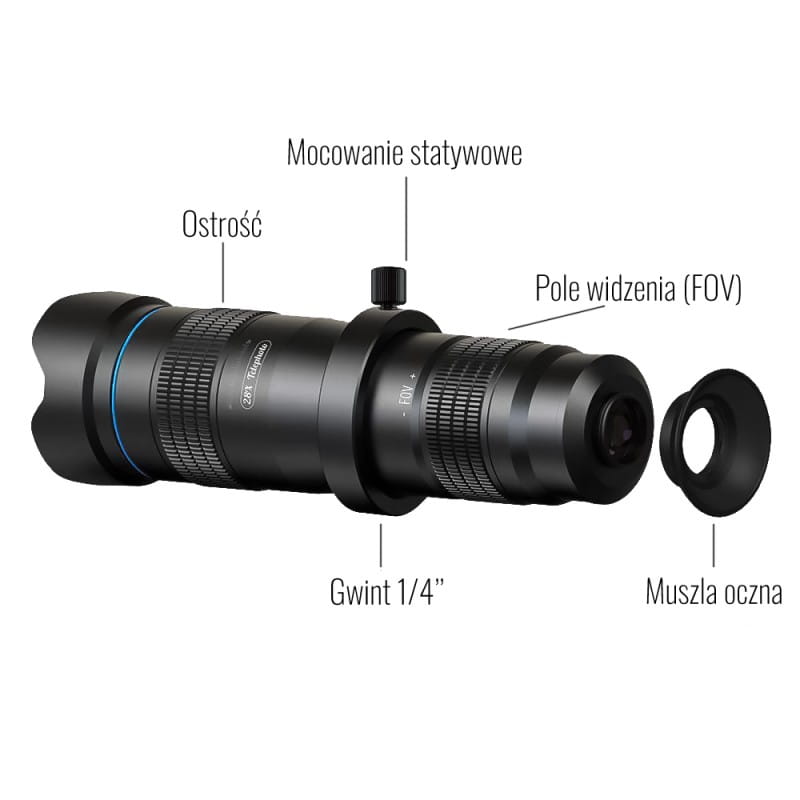 W zestawie z obiektywem znajdziemy obręcz - adapter z gwintowaniem 1/4'', przy pomocy którego całość zamontujemy na statywie fotograficznym. Do dyspozycji użytkownika jest także muszla oczna pozwalająca na prowadzenie obserwacji gołym okiem. Kompaktowy design i lekka konstrukcja sprawiają, że Apexel APL-JS28X jest wygodny w transporcie, co dodatkowo ułatwia niewielki futerał.