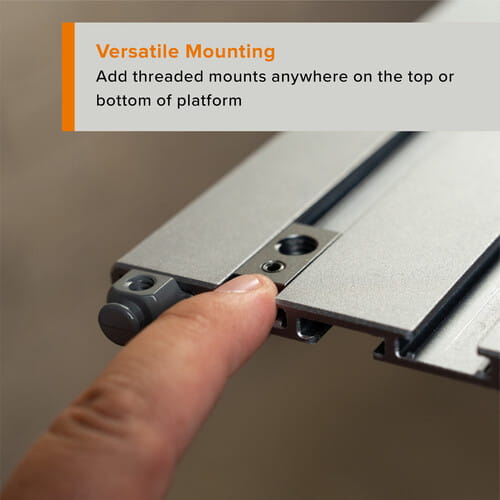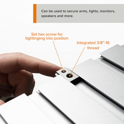Zaprojektowane z myślą o zwiększeniu użyteczności stacji roboczej, gwinty akcesoriów AeroTrac 3/8"-16 firmy Tether Tools umożliwiają bezpieczne zamocowanie ramion, monitorów, głośników i innego ciężkiego sprzętu do stacji roboczej AeroTrac. Gwinty te można umieścić wzdłuż górnej lub dolnej części szyny, co pozwala na bardziej spersonalizowany układ. Wykonane ze stopu aluminium, objęte są ograniczoną dożywotnią gwarancją.
