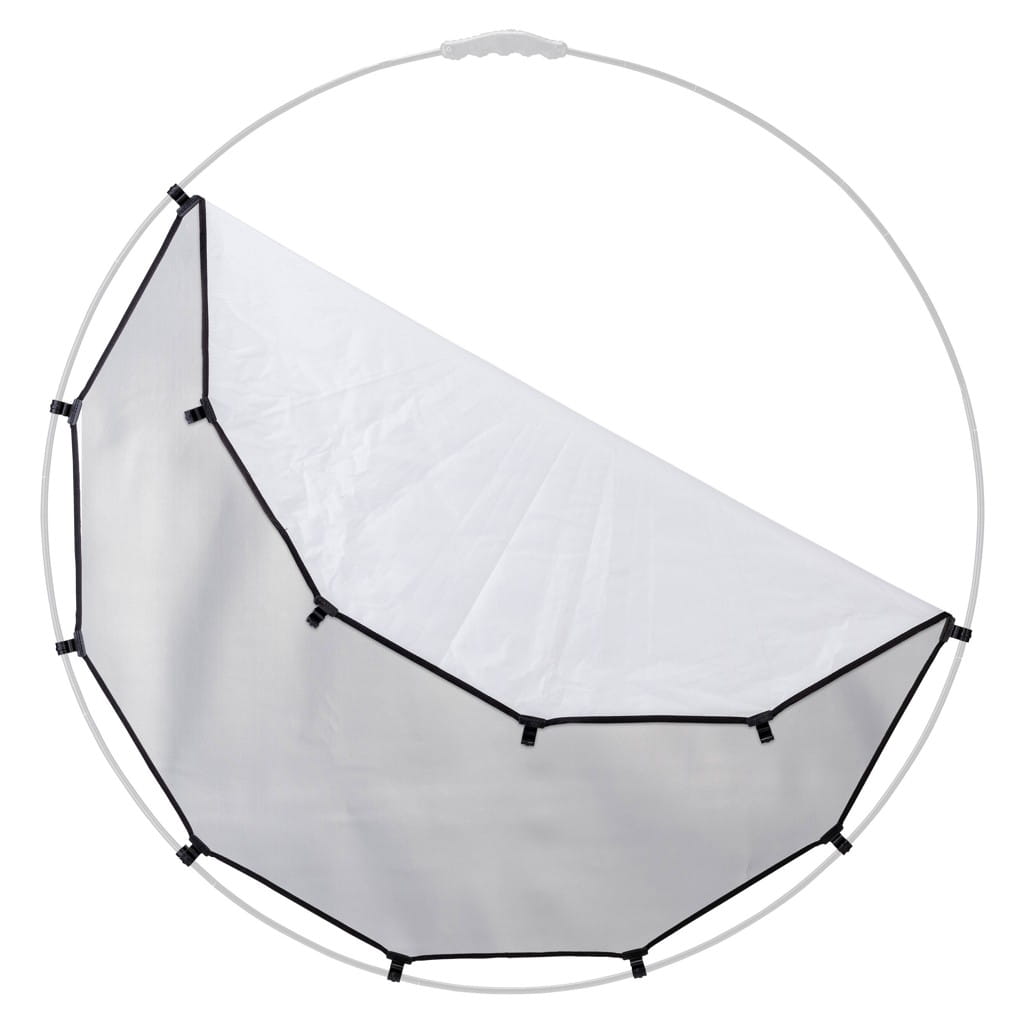 Dwustronna tkanina srebro-biała Lastolite HaloCompact LL LR3332 do stosowania z ramą HaloCompact Plus 98 cm. Może być wykorzystana jako dodatkowy ekran do blend HaloCompact Plus LL LR3331 lub jako rozszerzenie funkcjonalności dyfuzora HaloCompact LL LR3333.