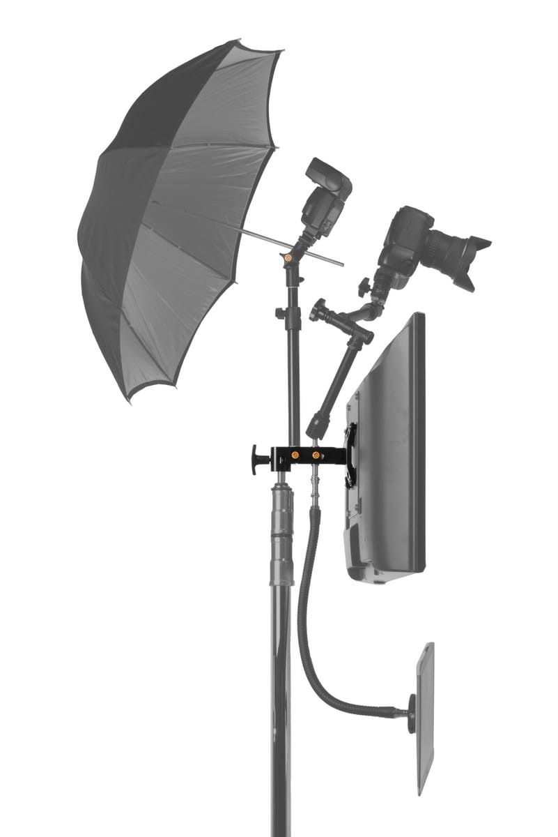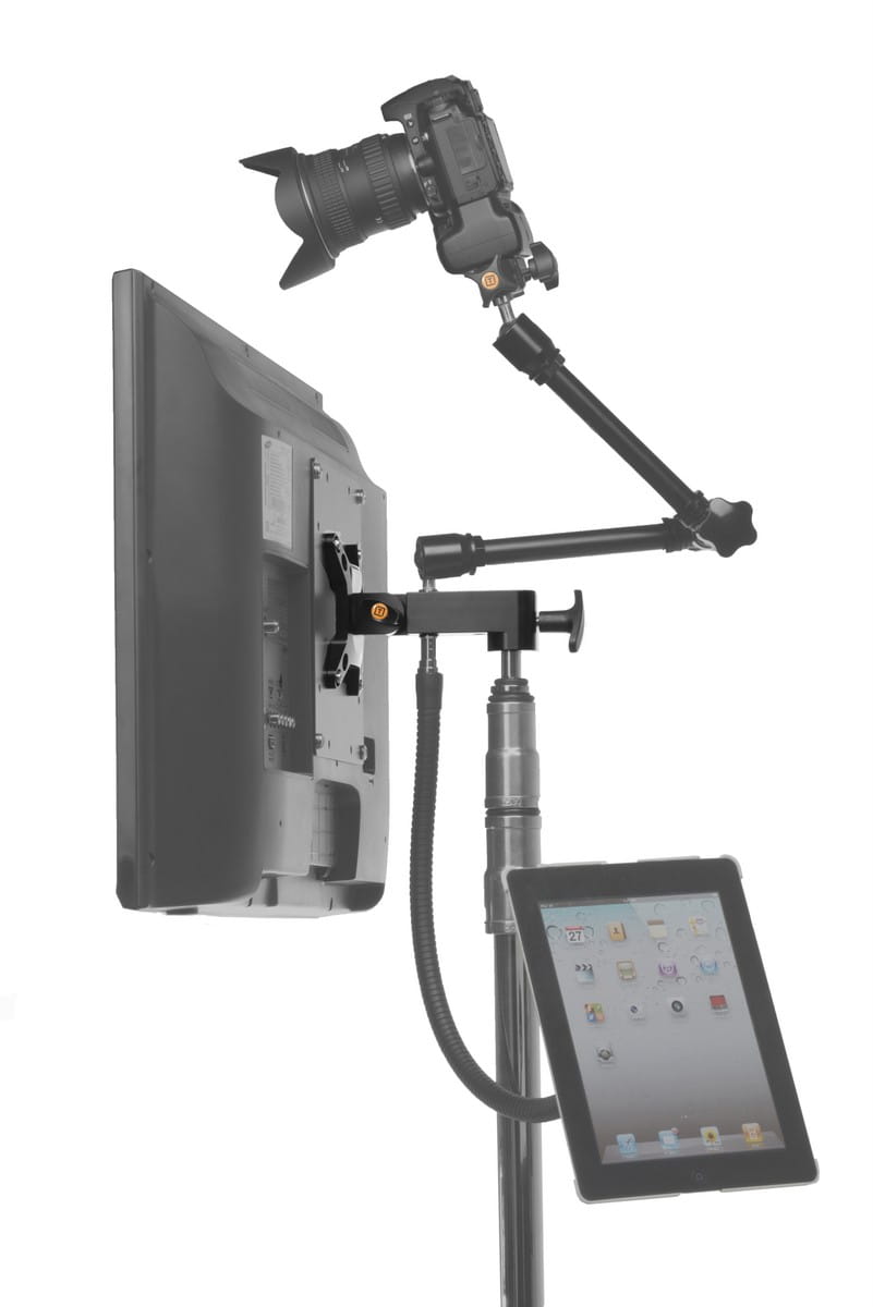 VESA Studio Monitor Mount to innowacyjny uchwyt pozwalający zamocować monitor na statywie studyjnym lub innym z gwintem 5/8 cala. Uchwyt umożliwia konfigurację poziomą lub pionową monitora w zależności od aktualnych potrzeb. Uchwyt VESA Studio Monitor posiada także dwa dodatkowe otwory montażowe 5/8 cala do można zamontować dodatkowe wyposażenie bezpośrednio lub za pomocą ramion Master Flex.