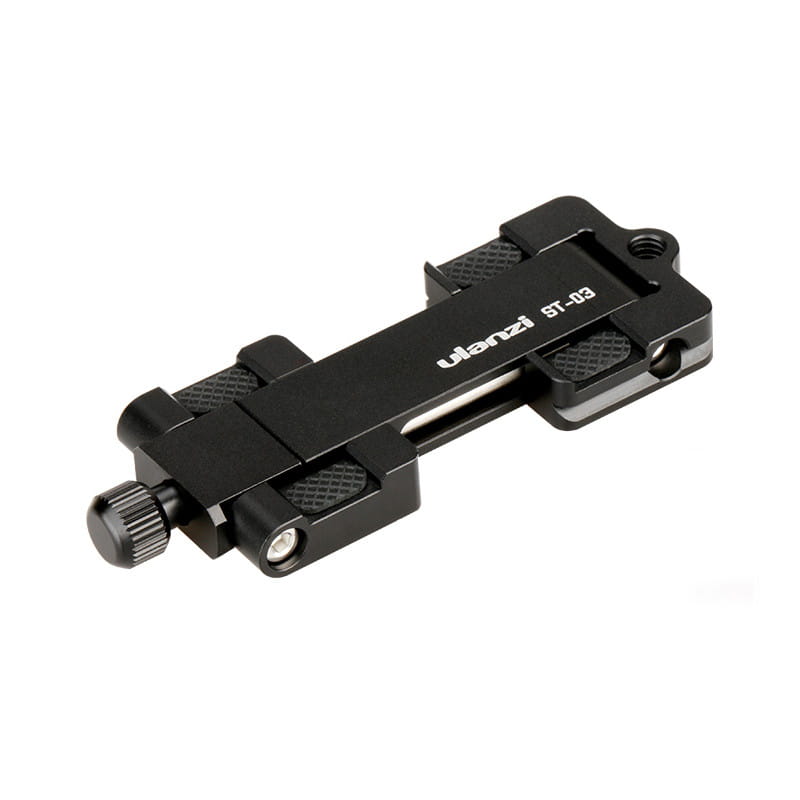 Ulanzi ST-03 to wytrzymały i praktyczny uchwyt do telefonu o szerokości od 58 do 104 mm. Posiada standardowe mocowanie statywowe 1/4'', przy pomocy którego możemy umieścić go na niemal dowolnym statywie fotograficznym, kijku selfie czy w uchwycie hand grip. Precyzyjny mechanizm zaciskowy regulowany za pomocą pokrętła gwarantuje mocny i pewny chwyt, a gumowe podkładki chronią obudowę smartfona przed zarysowaniami.