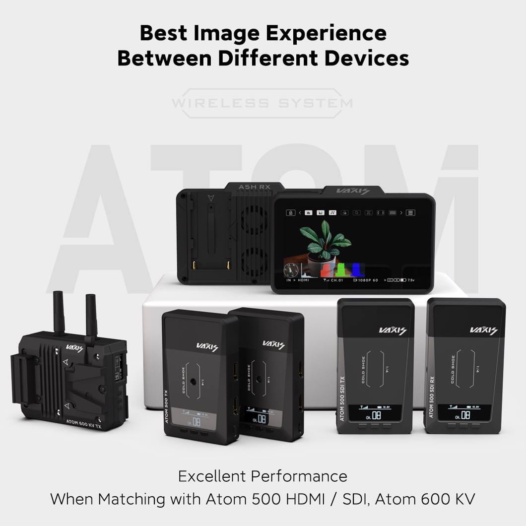 Kompatybilny z odbiornikiem Vaxis Atom A5H, Atom 500 HDMI/SDI i Atom 600 KV, ten monitor/nadajnik obsługuje wejście HDMI i transmisję wideo do 1080p60 do 160 metrów w linii widzenia, a także może przekazywać wideo przez wyjście pętli HDMI. Wbudowany nadajnik może wysyłać sygnał wideo do jednego odbiornika, a także do trzech aplikacji mobilnych w celu jednoczesnego monitorowania. Nadaje się zarówno do monitorowania, jak i ostrzenia, Atom A5H posiada wyświetlacz o jasności 1000 cd/m², który jest wystarczająco jasny do użytku na zewnątrz.