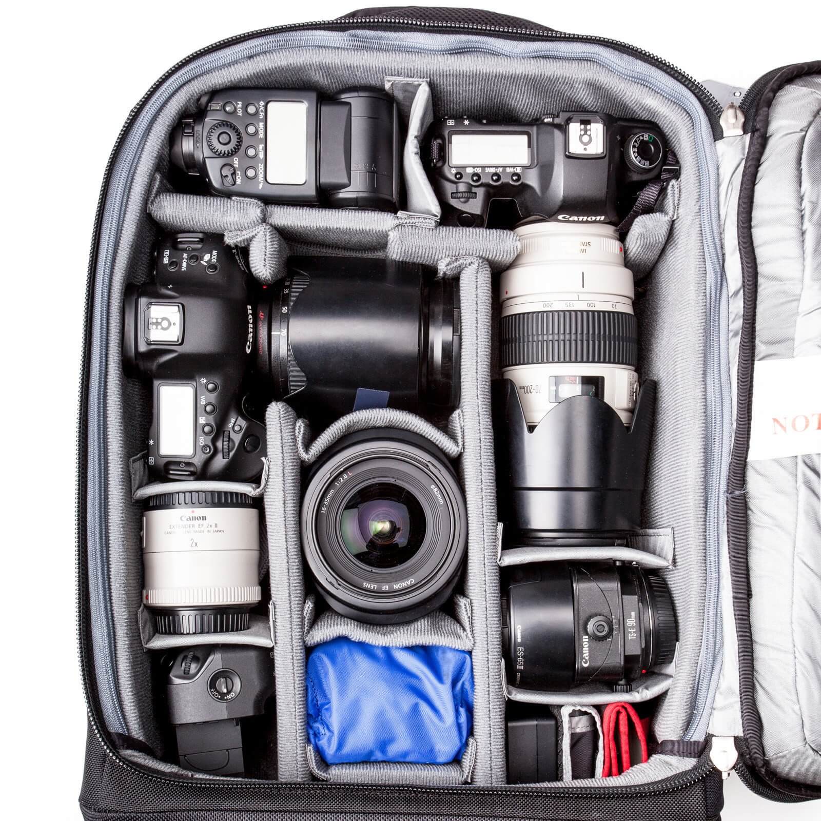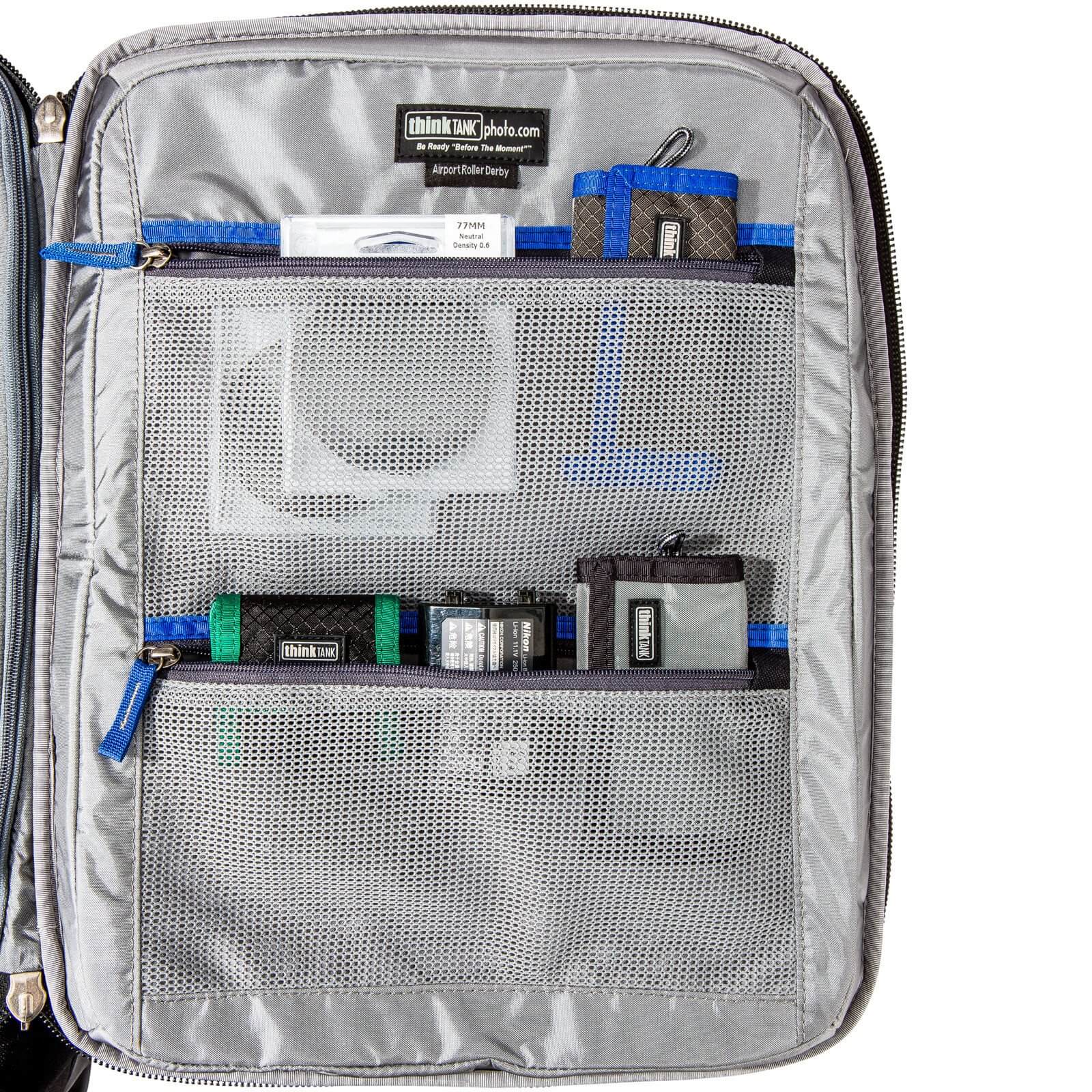 Think Tank Airport Roller Derby to gustowna walizka fotograficzna mogąca bezpiecznie przewozić 2 lustrzanki lub bezlusterkowce z podpiętymi obiektywami i 2/3 dodatkowe szkła. Cała wewnętrzna część głównej klapy wypełniona jest przezroczystymi kieszeniami na akcesoria i drobiazgi osobiste. Kolejna duża komora ma wyściełane kieszenie na laptopa i tableta.