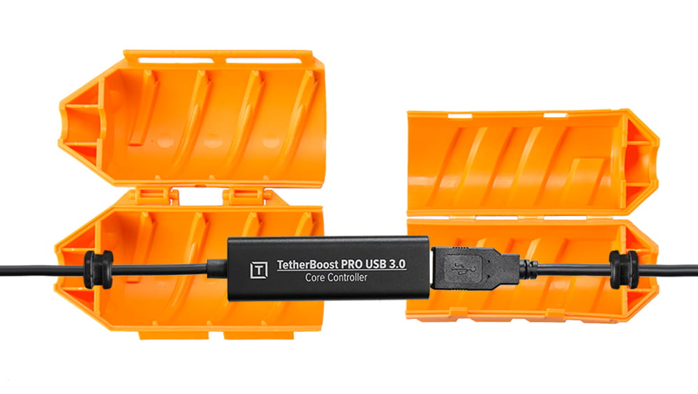 W zestawie TetherBoost Pro znajduje się TetherGuard Extension Lock, skuteczne urządzenie blokujące, które chroni końce kabli przed frustrującym rozłączeniem, uszkodzeniem i zagrożeniami elektrycznymi. Prosta konstrukcja clam-shell pozwala zamknąć TetherGuard Extension Lock wokół każdego końca kabla TetherBoost Pro i USB 3.0, a następnie przekręcić, aby zablokować przewody pewnie i bezpiecznie razem. TetherGuard Extension Lock jest dostarczany z dwoma dołączonymi gumowymi podkładkami, które uszczelniają połączenie, dodatkowo chroniąc połączenie i utrzymując kabel w miejscu.