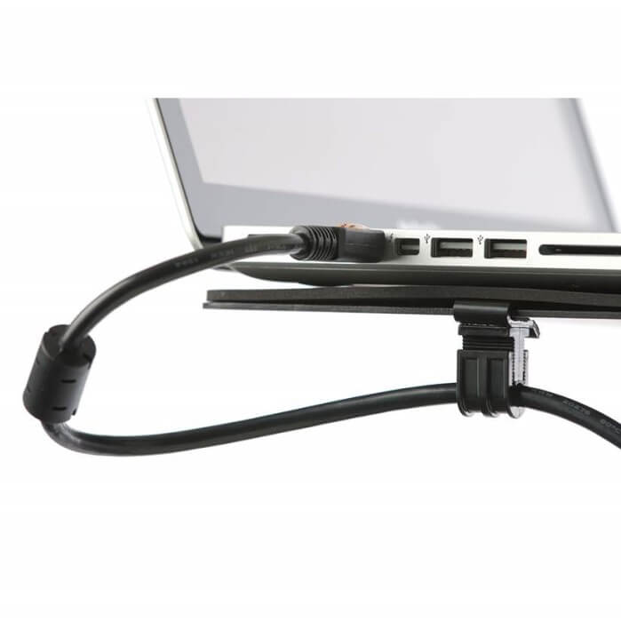 Kabel przymocowany za pomocą zabezpieczenia JerkStopper Aero Clip-on pozostaje na powierzchni blatu zamiast spadać za biurko. Dzięki temu unikniesz irytujących sytuacji, gdy konieczne jest uciążliwe sięganie po kabel, który najczęściej spada w trudno dostępne miejsca. Dodatkowo eliminuje powstawanie naprężeń podłączonych kabli, co pozwala uniknąć przypadkowego odłączenia i uszkodzenia portów. Zabezpieczenie jest kompatybilne z dowolnym standardowym kablem o średnicy w zakresie od 3,5 mm do 8,5 mm.