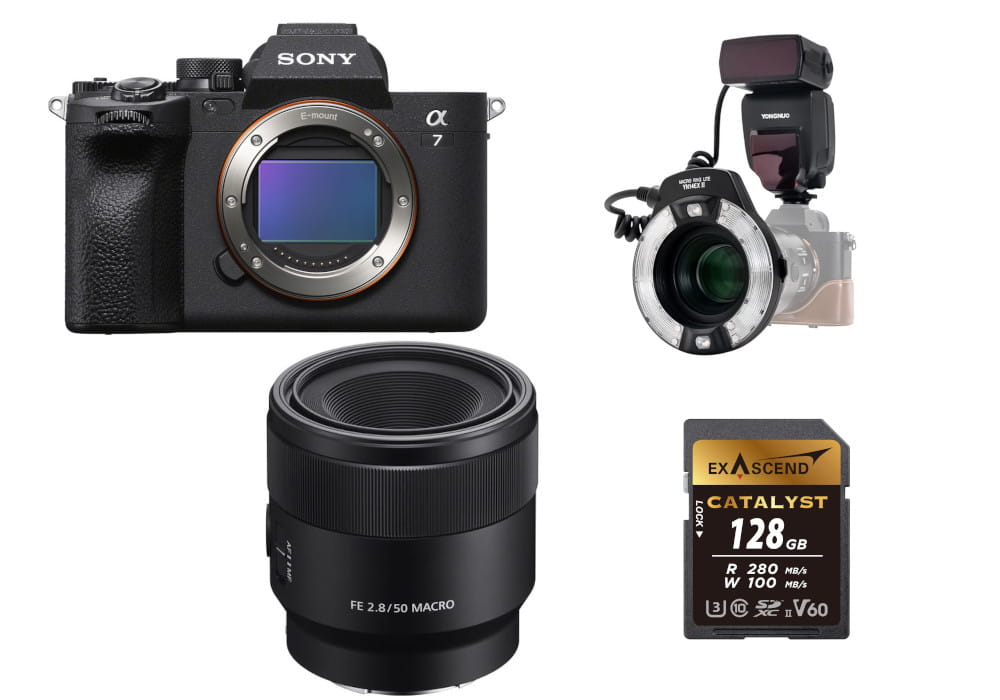 Zestaw aparat Sony A7 IV body + Obiektyw Sony FE 50 mm F2.8 Macro SEL50M28 + Pierścieniowa lampa błyskowa macro Yongnuo YN-14 EX II + Karta pamięci ExAscend Catalyst UHS-II V60 128GB