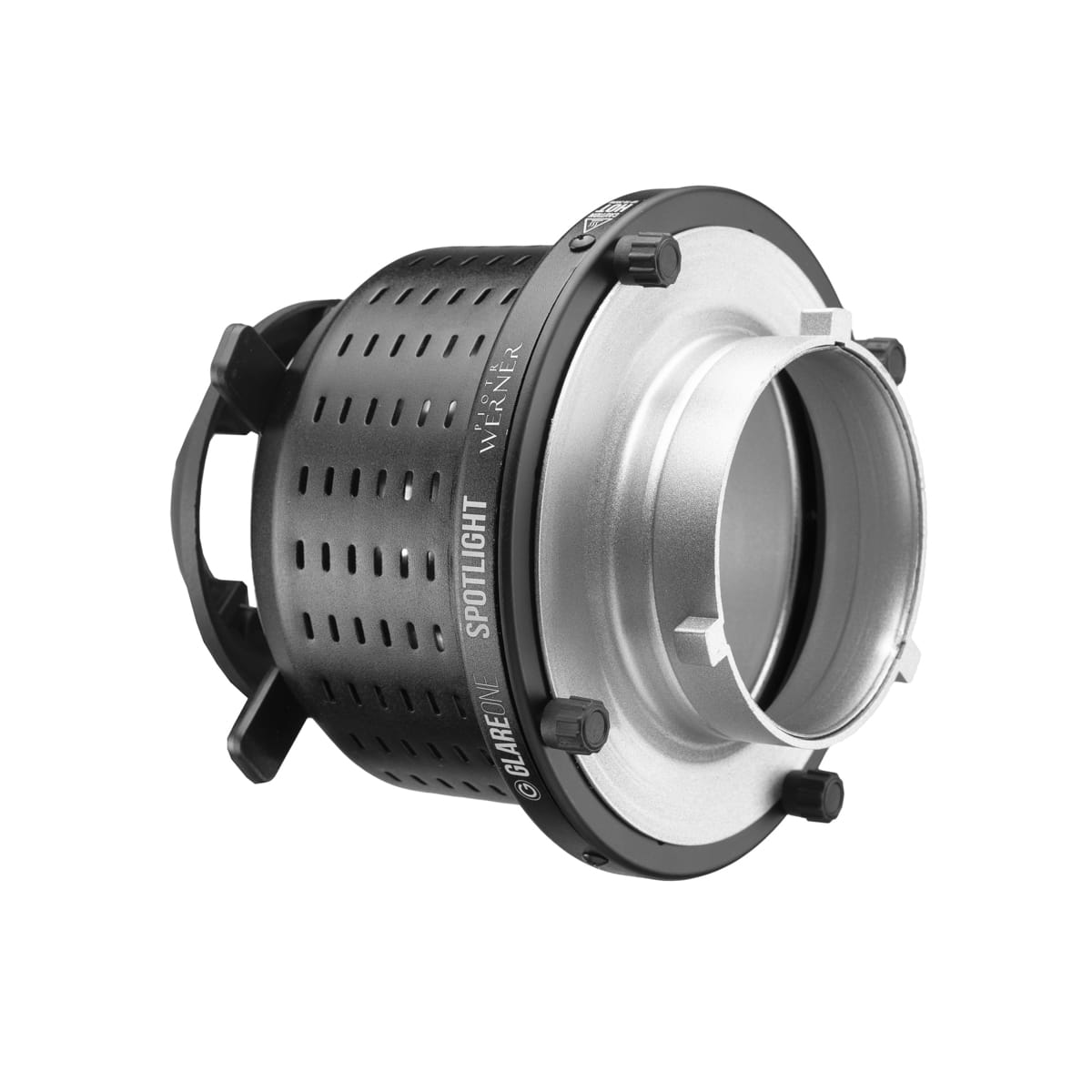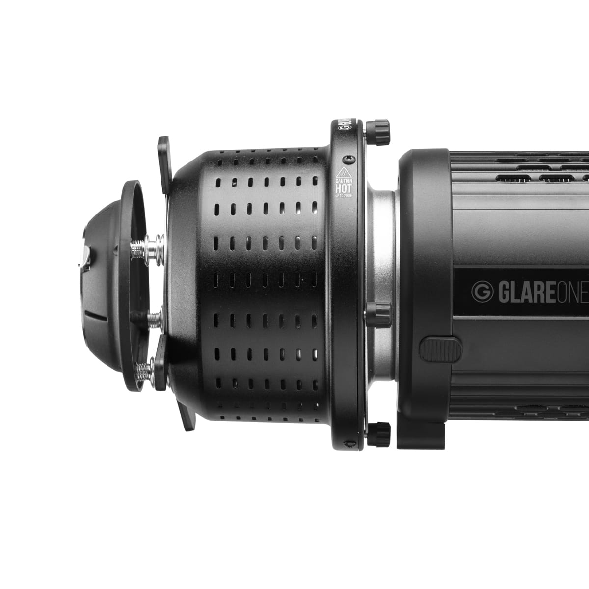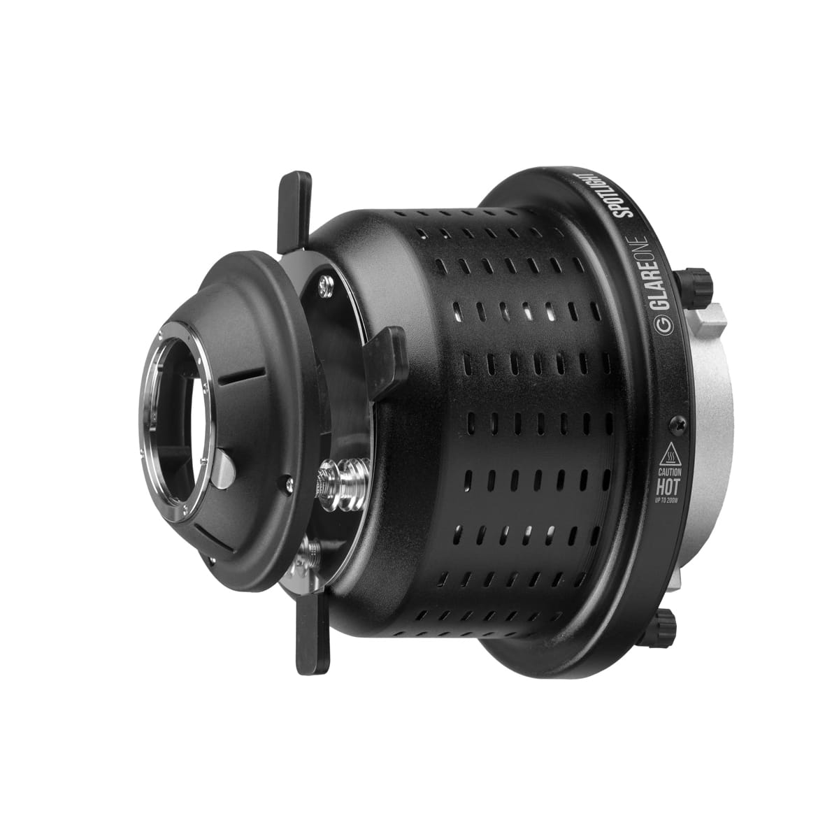 GlareOne Spotlight to optyczna strumienica, kompatybilna z obiektywami GlareOne 50, 85 oraz 150 mm. Posiada zastawki pozwalające kształtować strumień światła oraz możliwość montażu filtrów Gobo. Korpus strumienicy wykonany jest z metalu i pozwala na użycie lamp błyskowych do 600 Ws lub LED o mocy do 200 watów.