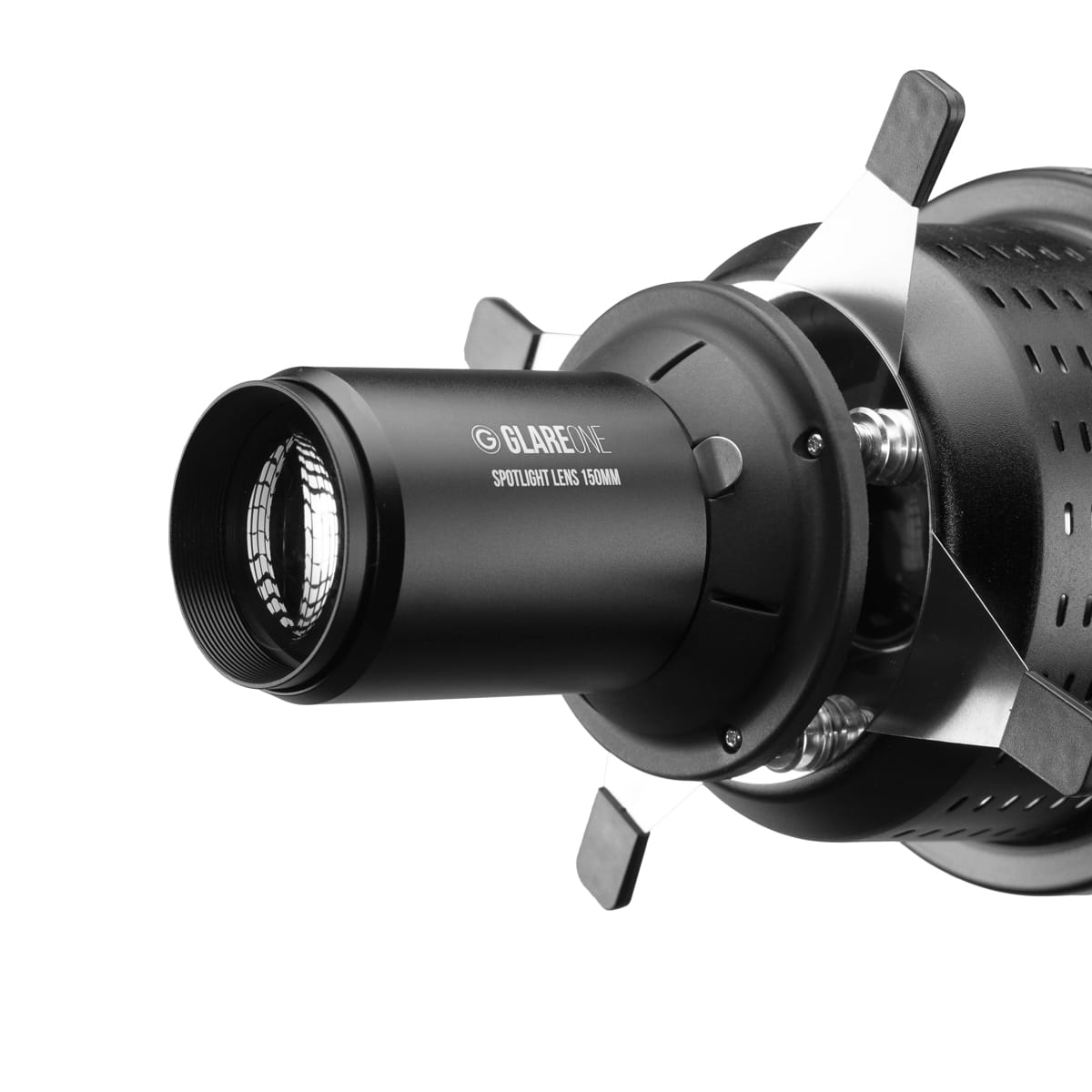 GlareOne Spotlight 150 mm to obiektyw kompatybilny ze strumienicą GlareOne Spotlight. Konstrukcja wykonana jest z metalu i ma możliwość regulacji ostrości rzutowanego obrazu.