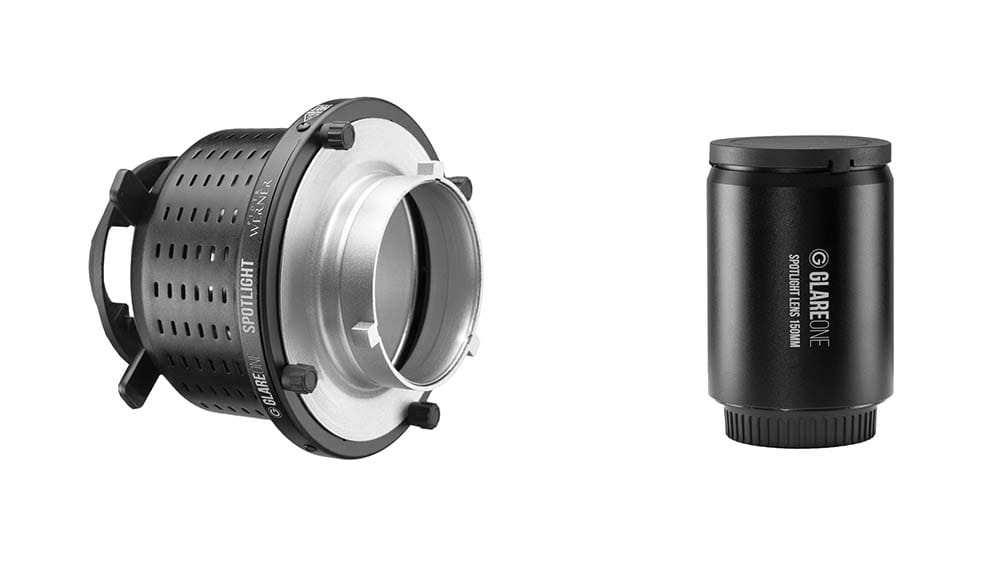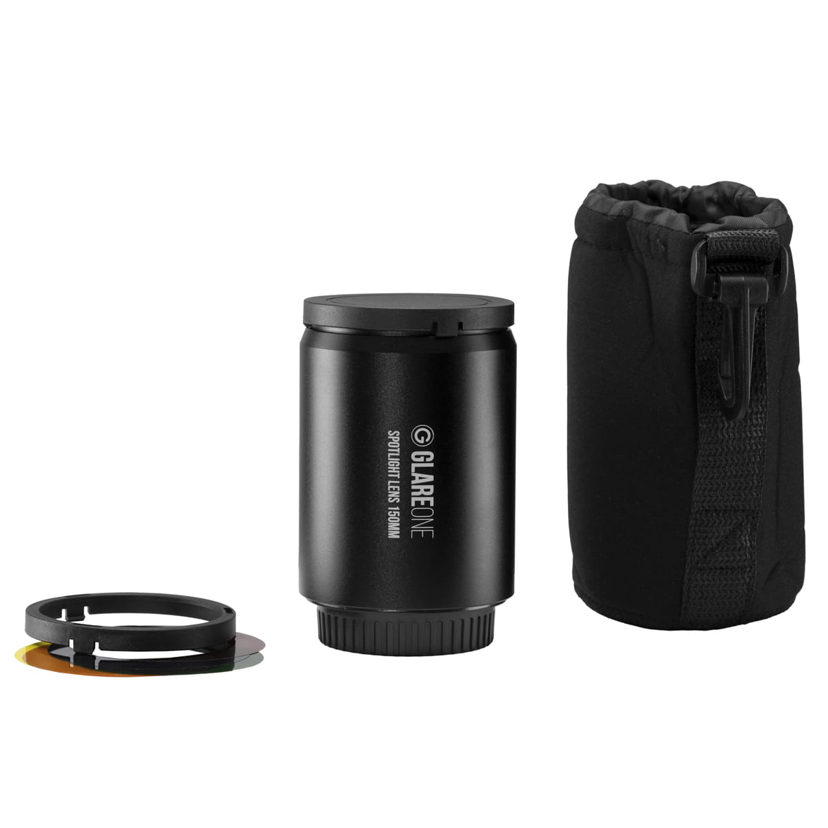 W strumienicy optycznej takiej jak Spotlight najważniejszy jest obiektyw. Obiektywy w ofercie GlareOne to sześciosoczewkowe apochromaty o ogniskowej 50, 85 oraz 150 mm. Pozwalają na uzyskanie bardzo ostrych krawędzi światła i cienia. Jest to niezwykle istotne, jeżeli chce się uzyskać pełną kontrolę nad oświetleniem na planie zdjęciowym. Ponadto obiektywy są zaprojektowane w taki sposób, aby zminimalizować aberrację chromatyczną, która może powodować kolorowe zabarwienia. Obiektyw należy kupić osobno, nie znajduje się w zestawie.