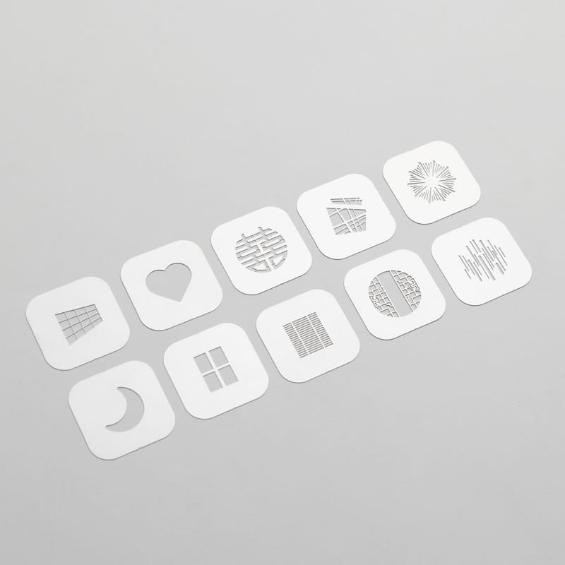 W zestawie dostarczane jest 10 efektów gobo, pozwalających na stworzenie specyficznych efektów oświetleniowych. Przykładowo możesz szybko uzyskać efekt światła wpadającego przez przysłonięte przez żaluzje okno. W zestawie znajdują się takie efekty jak np. serce, księżyc, chińskie okno itp.